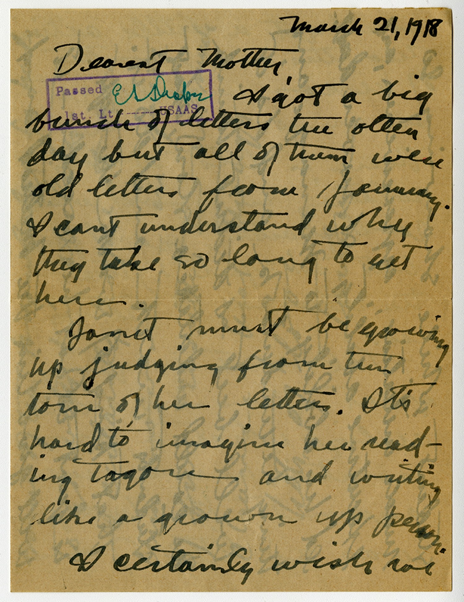 March 21, 1918 Dearest Mother, [censor’s stamp] I got a big bunch of letters the other day but all of them were old letters from January. I can't understand why they take so long to get here. Janet must be growing up judging from the tone of her letters. It's hard to imagine her reading Tagore and writing like a grown up person. I certainly wish we