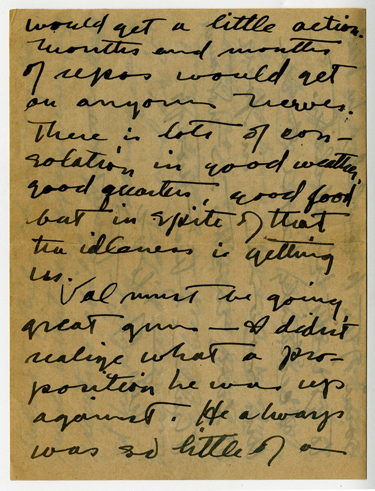 would get a little action. Months and months of repos would get on anyone's nerves. There is lots of consolation in good weather, good quarters, good food but in spite of that the idleness is getting us. Val must be going great guns I didn't realize what a proposition he was up against. He always was so little of a