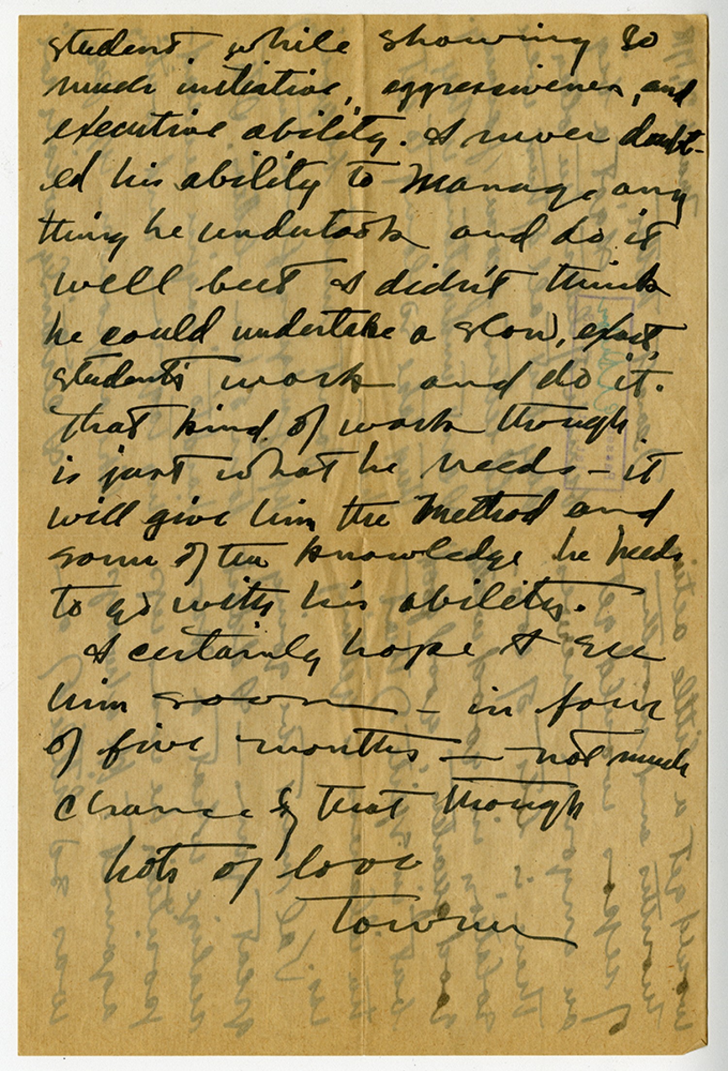 student, while showing so much initiative, aggressiveness, and executive ability. I never doubted his ability to manage anything he undertook and do it well but I didn't think he could undertake a slow, exact, student's word and do it. That kind of work though is just what he needs it will give him the method and some of the knowledge he needs to go with his ability. I certainly hope to see him soon in four or five months not much chance of that though. Lots of love, Towner