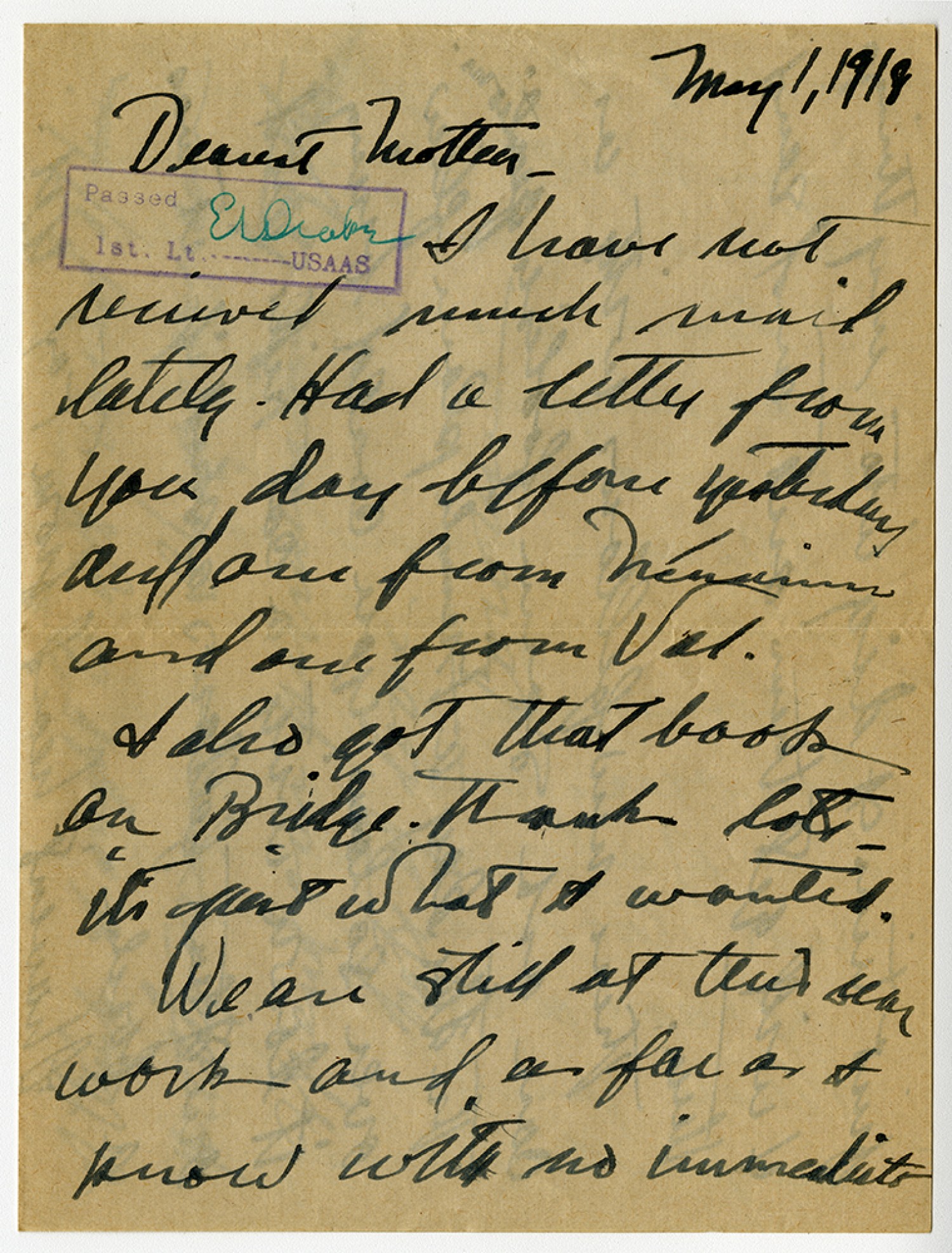 May 1, 1918 Dearest Mother, [censor’s stamp] I have not received much mail lately. Had a letter from you day before yesterday and one from Nenaine and one from Val. I also got that book on bridge. Thanks lots. It's just what I wanted. We are still at the rear work and as far as I know with no immediate
