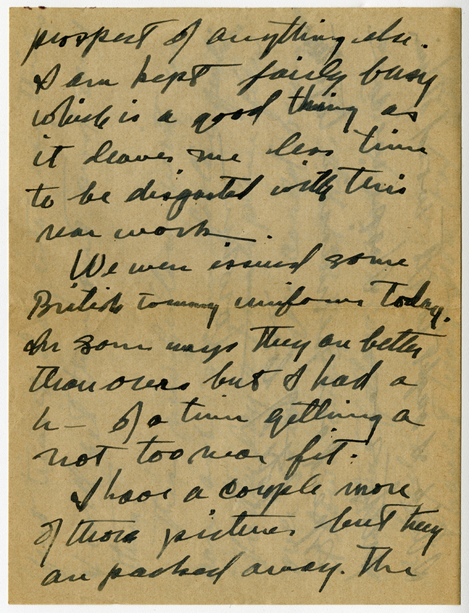 prospect of anything else. I am kept fairly busy which is a good thing as it leaves me less time to be disgusted with this rear work. We were issued some British tommy uniforms today. In some ways they are better than ours but I had a h _ of a time getting a not too near fit. I have a couple more of those pictures but they are packed away. The