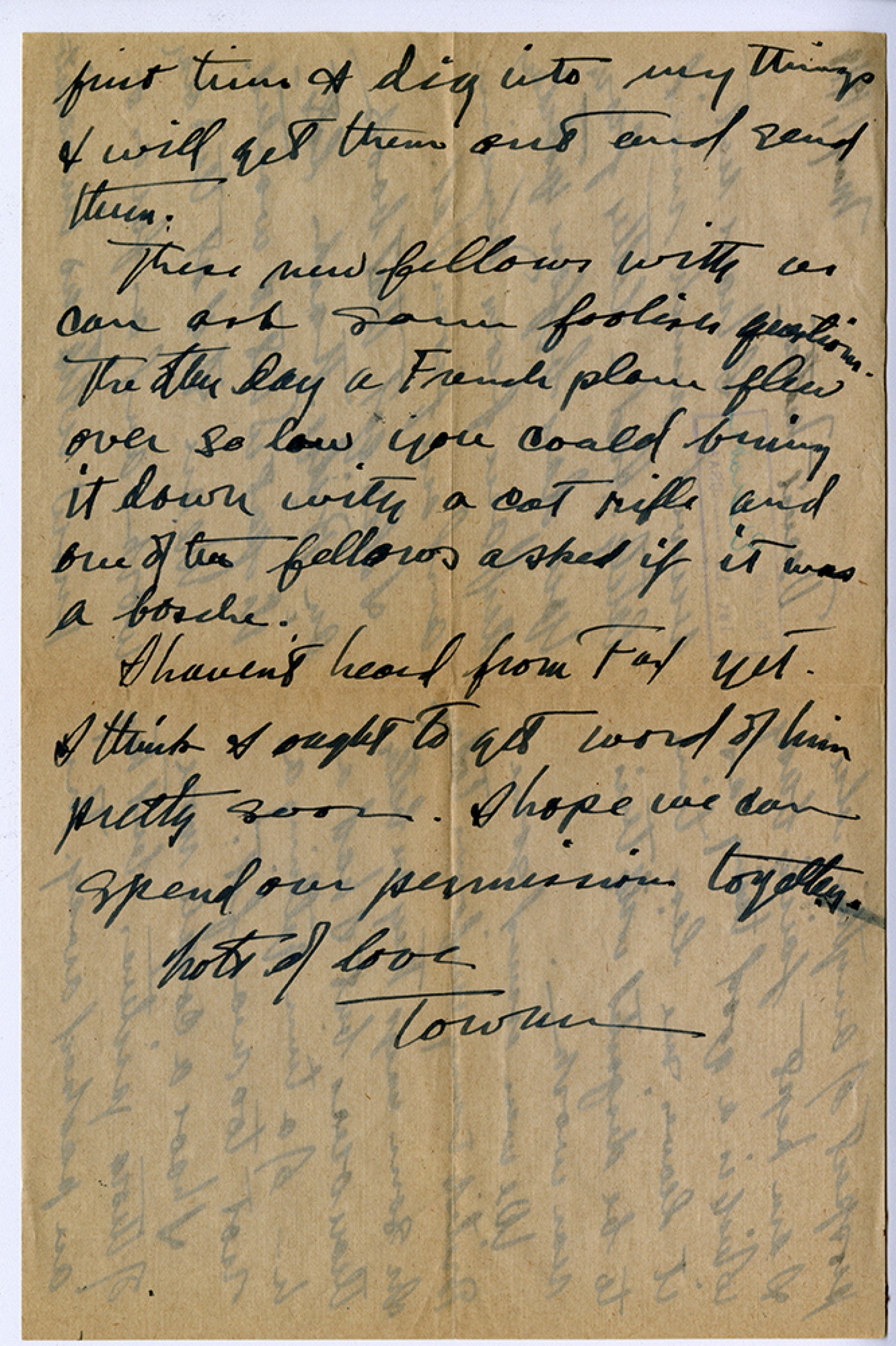 first time I dig into my things I will get them out and send them. These new fellows with us can ask some foolish questions. The other day a French plane flew over so low you could bring it down with a cat rifle and one of the fellows asked if it was a bosche. I haven't heard from Fax yet. I think I ought to get word of him pretty soon. I hope we can spend our permission together. Lots of love, Towner