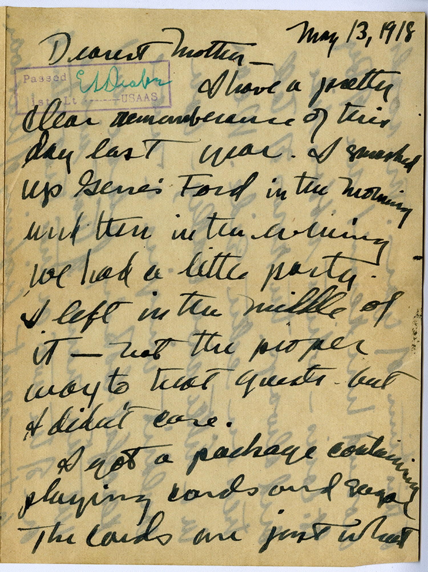 May 13, 1918 Dearest Mother, [censor’s stamp] I have a pretty clear remembrance of this day last year. I smashed up Gene's Ford in the morning. We had a little party. I left in the middle of it not the proper way to treat guests but I didn't care. I got a package containing playing cards and sugar. The cards are just what