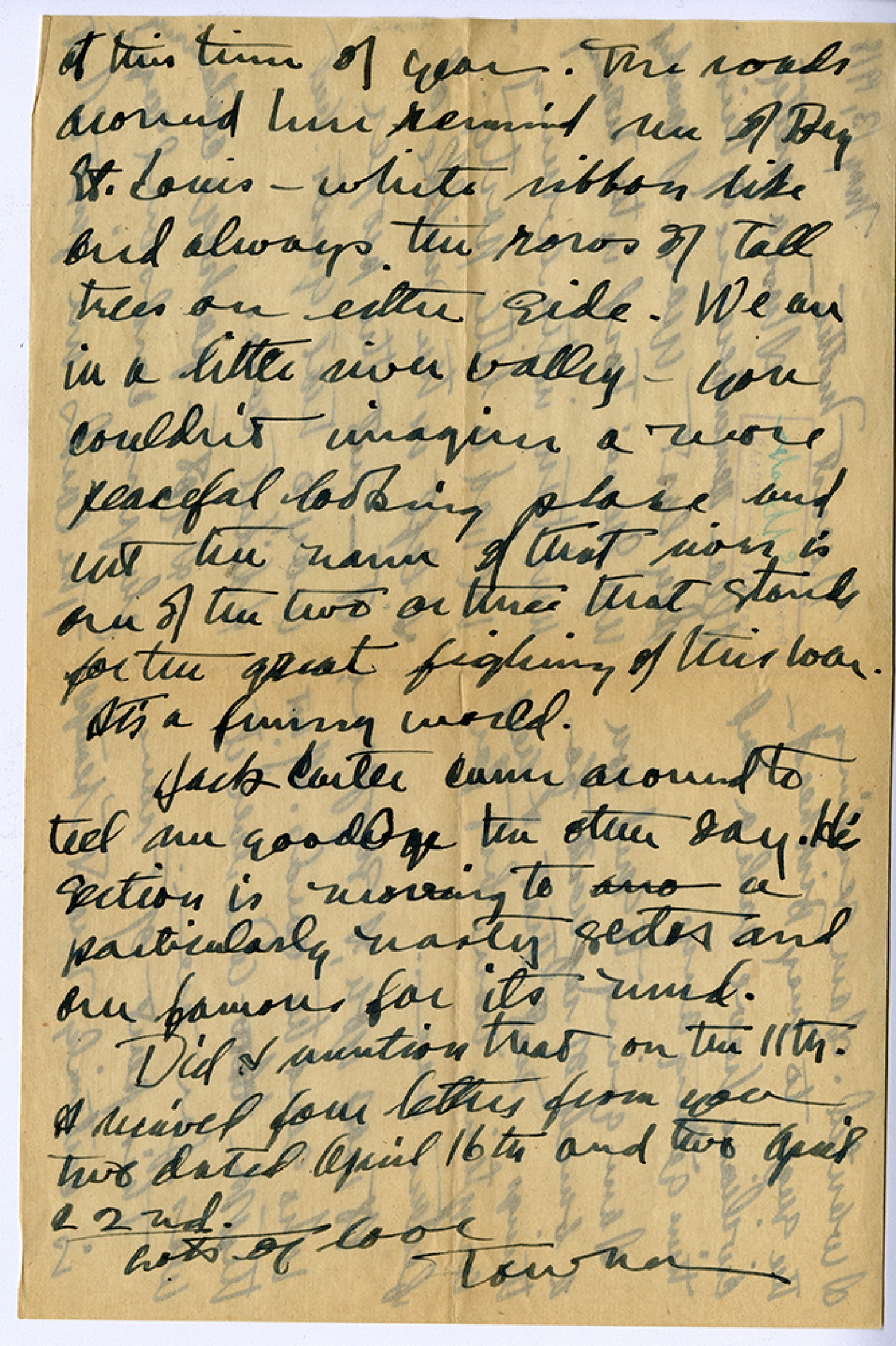 at this time of year. The roads around here remind me of Bay St. Louis white ribbon like and always the rows of tall trees on either side. We are in a little river valley you couldn't imagine a more peaceful looking place and not the name of that river is one of the two actions that stands for the great fighting of this war. It's a funny world. Jack Carter came around to tell me goodbye the other day. His section is moving to a particularly nasty sector and is famous for its mud. Did I mention that on the 11th I received four letters from you two dated April 16 and April 22nd. Lots of love, Towner