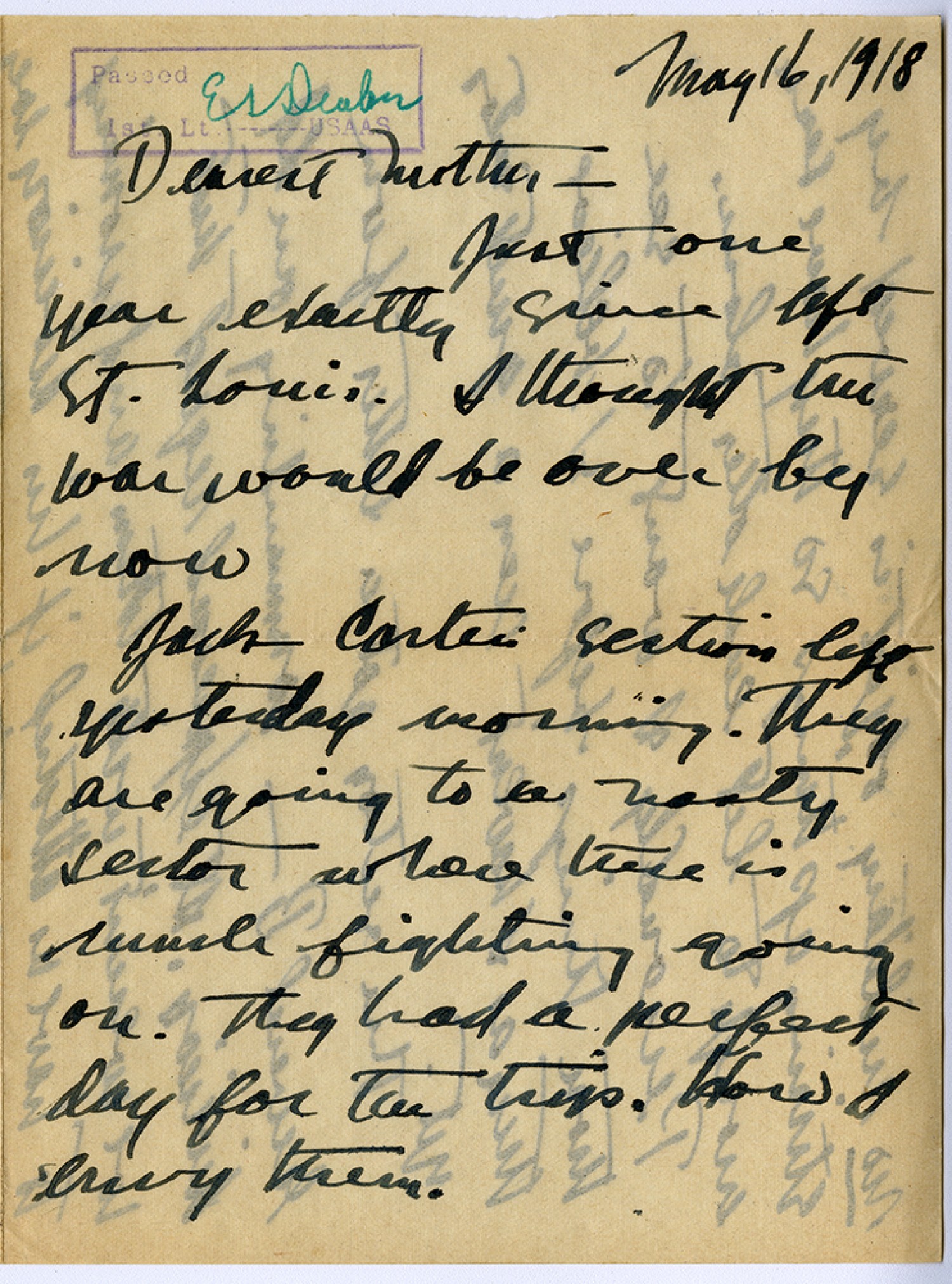May 16, 1918 [censor’s stamp] Dearest Mother, Just one year exactly since left St. Louis. I thought the war would be over by now. Jack Carter's section left yesterday morning. They are going to a nasty sector where there is much fighting going on. They had a perfect day for the trip. How I envy them.