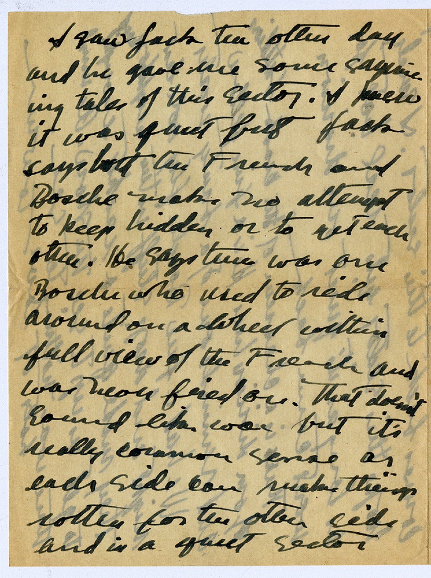 I saw Jack the other day and he gave me some [sanguinary] tales of this sector. I knew it was quiet but Jack says that the French and Bosche make no attempt to keep hidden or to get each other. He says there was one Bosche who used to ride around on a wheel within full view of the French and was never fired on. That doesn't sound like war but it's really common sense as each side can make things rotten for the other side and in a quiet sector