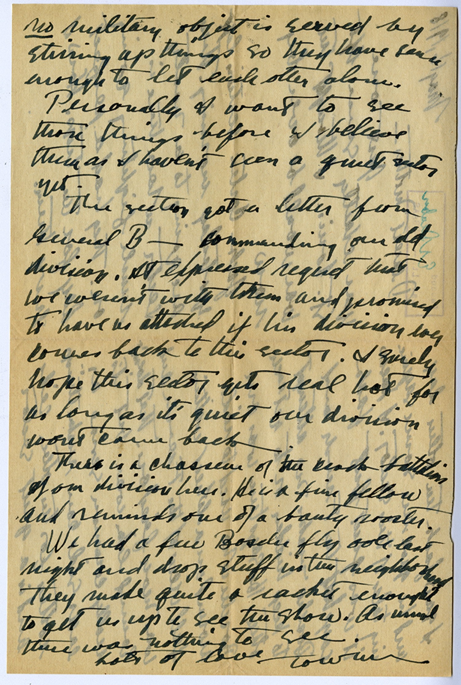 no military object is served by stirring up things so they have sense enough to leave each other alone. Personally I want to see those things before I believe them as I haven't seen a quiet sector yet. This section got a letter from General B________ commanding our old division. It expressed regret that we weren't with them and promised to have us attached if his division ever comes back to this sector. I surely hope this sector gets real hot for as long as it's quiet our division won't come back. There is a chasseur of the crack battalion of our division here. He is a fine fellow and reminds me of a banty rooster. We had a few Bosche fly over last night and drop stuff in the neighborhood. They made quite a racket enough to get me up to see the show. As usual there was nothing to see. Lots of love, Towner