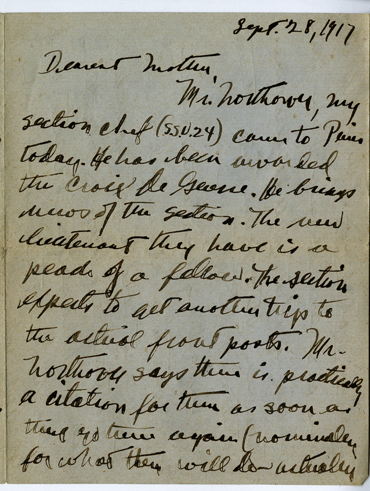 [September] 28, 1917 Dearest Mother, Mr. Northover, my section chief (S.S.U. 24) came to Paris today. He has been awarded the Croix de Guerre. He brings news of the section. The new lieutenant they have is a peach of a fellow. The section expects to get another trip to the actual front posts. Mr. Northover says there is practically a citation for them as soon as they go there again (nominally for what they will do actually