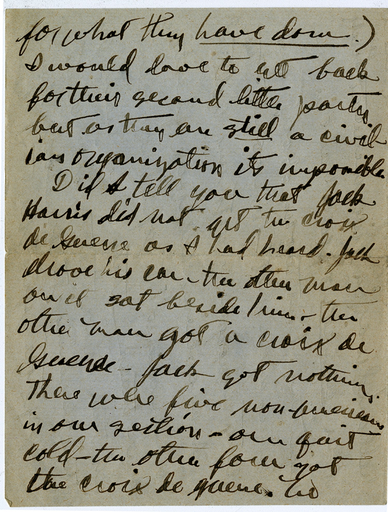 for what they have done.) I would love to get back for their second little party but as they are still a civilian organization it's impossible. Did I tell you that Jack Harris did not get the Croix de Guerre as I had heard. Jack drove his car the other man on it sat beside him. The other man got a Croix de Guerre. Jack got nothing. There were five non Americans in our section one quit cold the other four got the Croix de Guerre. No