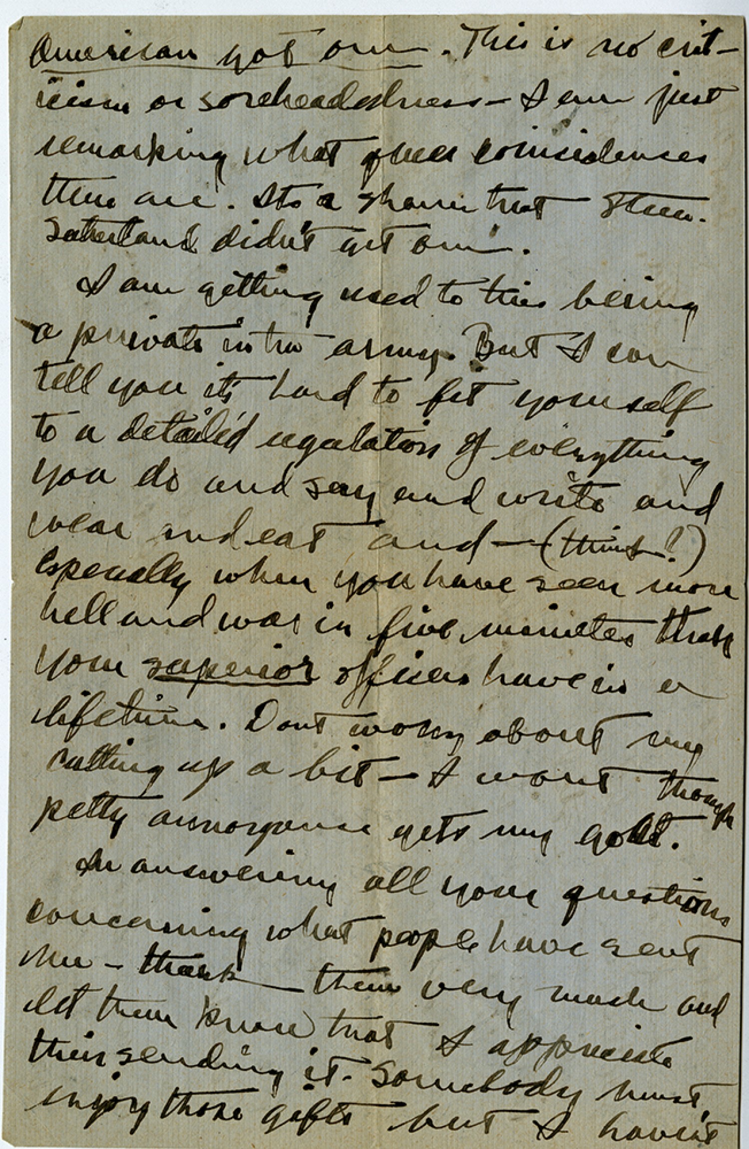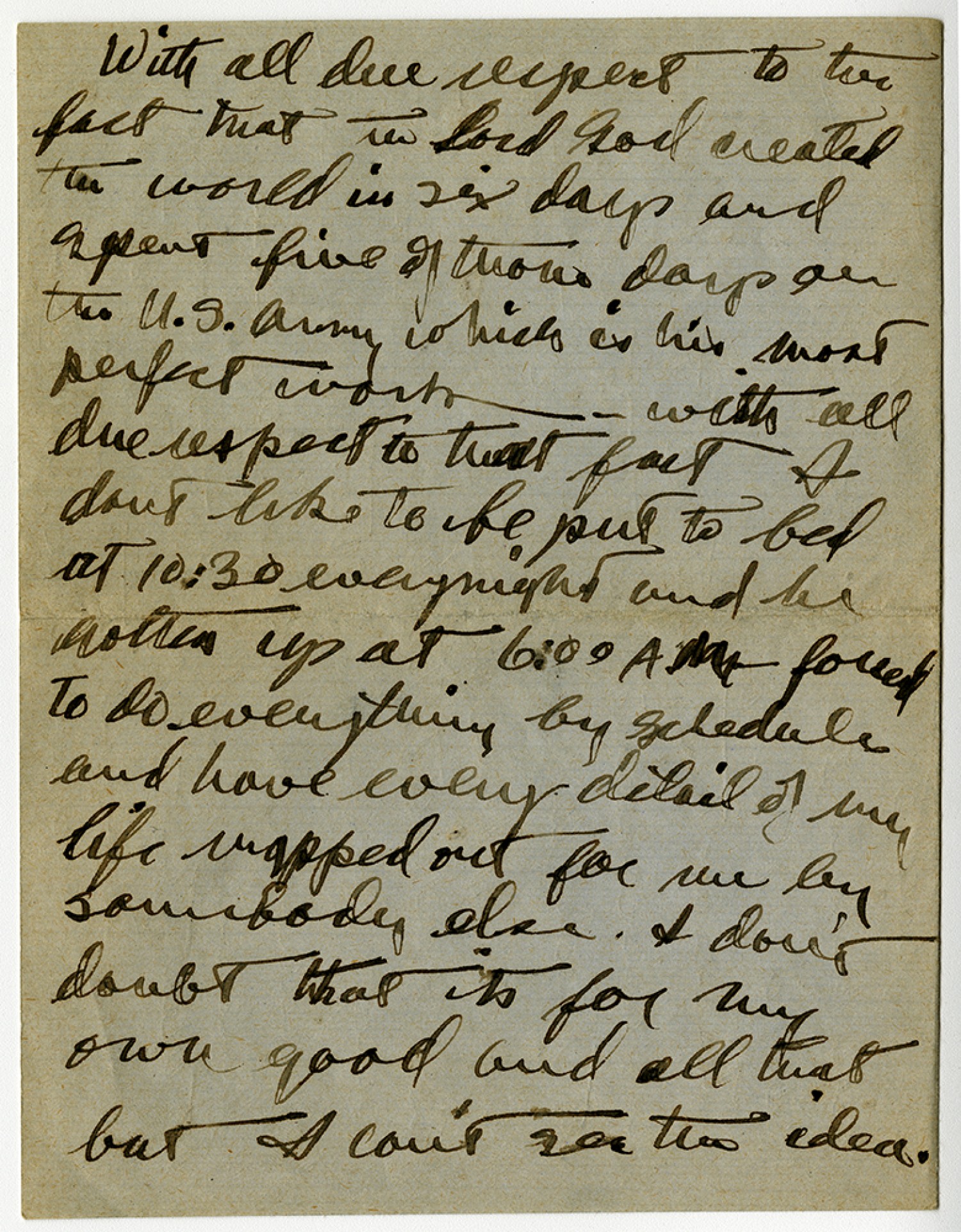 With all due respect to the fact that the Lord God created the world in six days and spent five of those days on the US Army which is his most perfect work with all due respect to that fact I don't like to be put to bed at 10:30 every night and be gotten up at 6:00 A.M. forced to do everything by schedule and have every detail of my life mapped out for me by somebody else. I don't doubt that it's for my own good and all that but I can't see the idea.