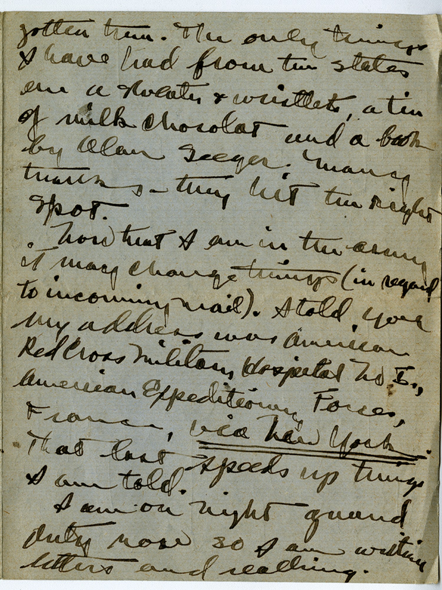 gotten them. The only things I have had from the states are sweater & wristlets, a tin of milk chocolate and a book by Alan Seeger. Many thanks they hit the right spot. Now that I am in the army it may change things (in regard to incoming mail). I told you my address was American Red Cross Military Hospital No. 5, American Expeditionary Forces, France, via New York. That last speeds up things I am told. I am on night guard duty now so I am writing letters and reading.