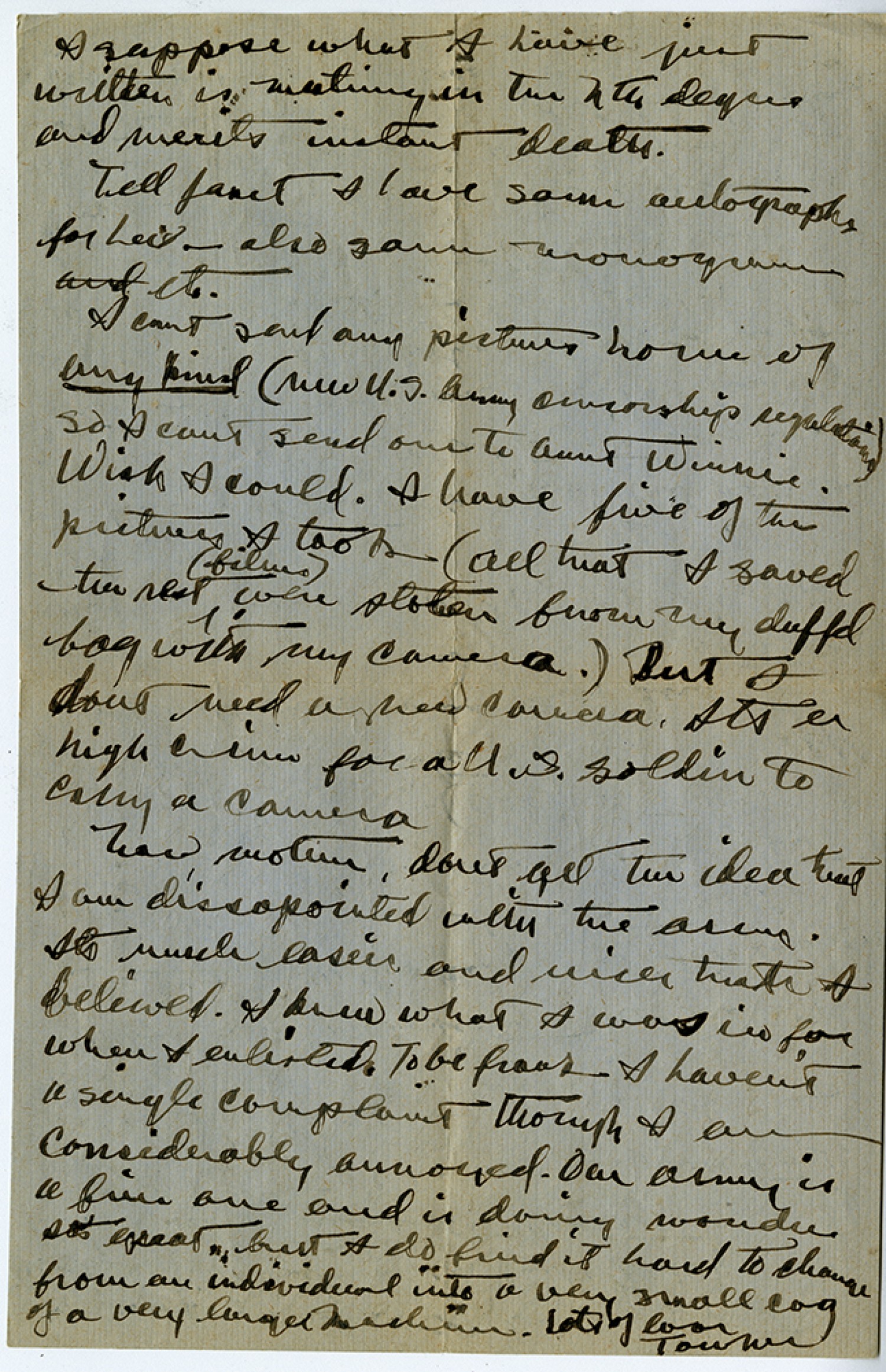 I suppose what I have just written is mutiny in the nth degree and merits instant death. Tell Janet I have some autographs for her also some monograms etc. I can't send any pictures home of any kind (new U.S. Army censorship regulations) so I can't send one to Aunt Winnie. Wish I could. I have five of the pictures I took (all that I saved the rest were stolen from my duffel bag with my camera.) But I don't need a new camera. It's a high crime for a U.S. soldier to carry a camera. Now, Mother, don't get the idea that I am disappointed with the army. It's much easier and nicer than I believed. I knew what I was in for when I enlisted. To be frank I haven't a single complaint though I am considerably annoyed. Our army is a fine one and is doing wonders. It's great, but I do find it hard to change from an individual into a very small cog of a very large machine. Lots of love, Towner