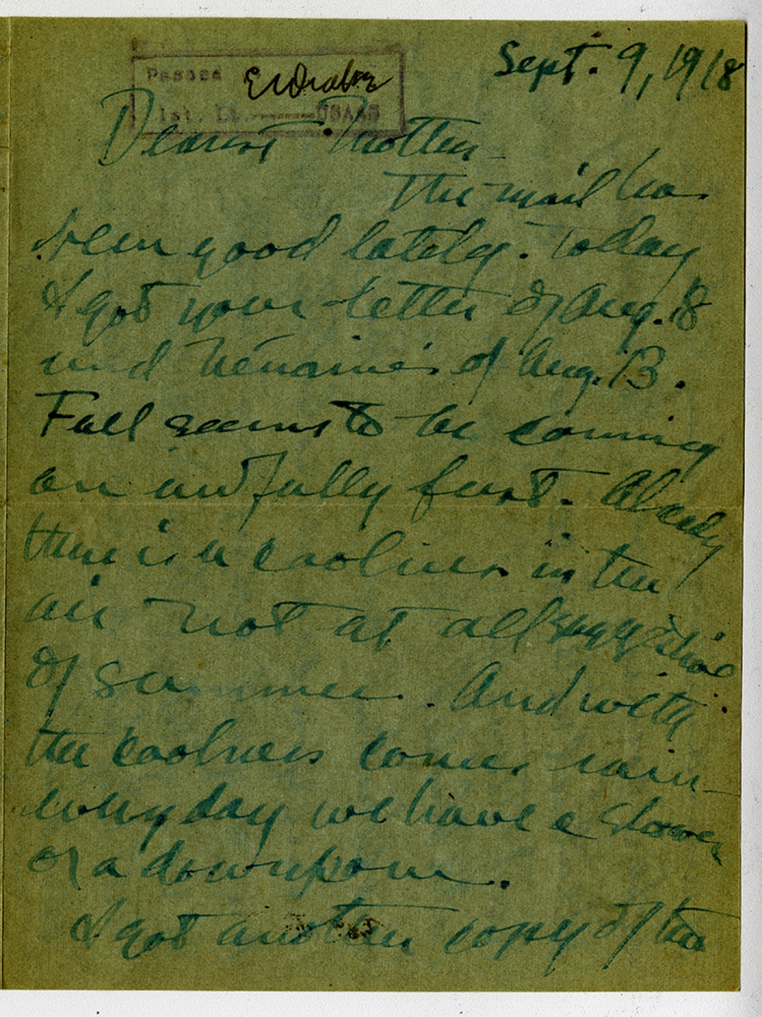 [September] 9, 1918 [censor’s stamp] Dearest Mother, The mail has been good lately. Today I got your letter of [August] 18 and Nenaine's of [August] 13. Fall seems to be coming on awfully fast.. Already there is a coolness in the air not at all suggestive of summer. And with the coolness comes rain every day we have a storm or a downpour. I got another copy of the