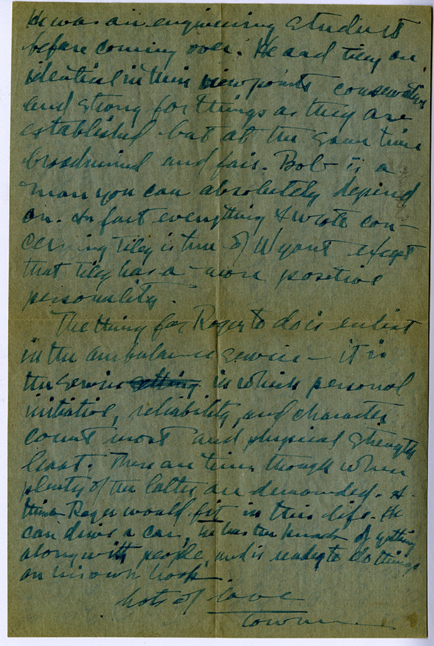 He was an engineering student before coming over. He and Tiley are identical in their viewpoints conservative and strong for things as they are established but at the same time broadminded and fair. Bob is a man you can absolutely depend on. In fact everything I wrote concerning Tiley is true of Wyant except that Tiley has a more positive personality. The thing for Roger to do is enlist in the ambulance service it is the service in which personal initiative, reliability and character count most and physical strength least. There are times though when plenty of the latter are demanded. I think Roger would fit in this life. He can drive a car, he has the knack of getting along with people, and is ready to do things on his own hook. Lots of love, Towner