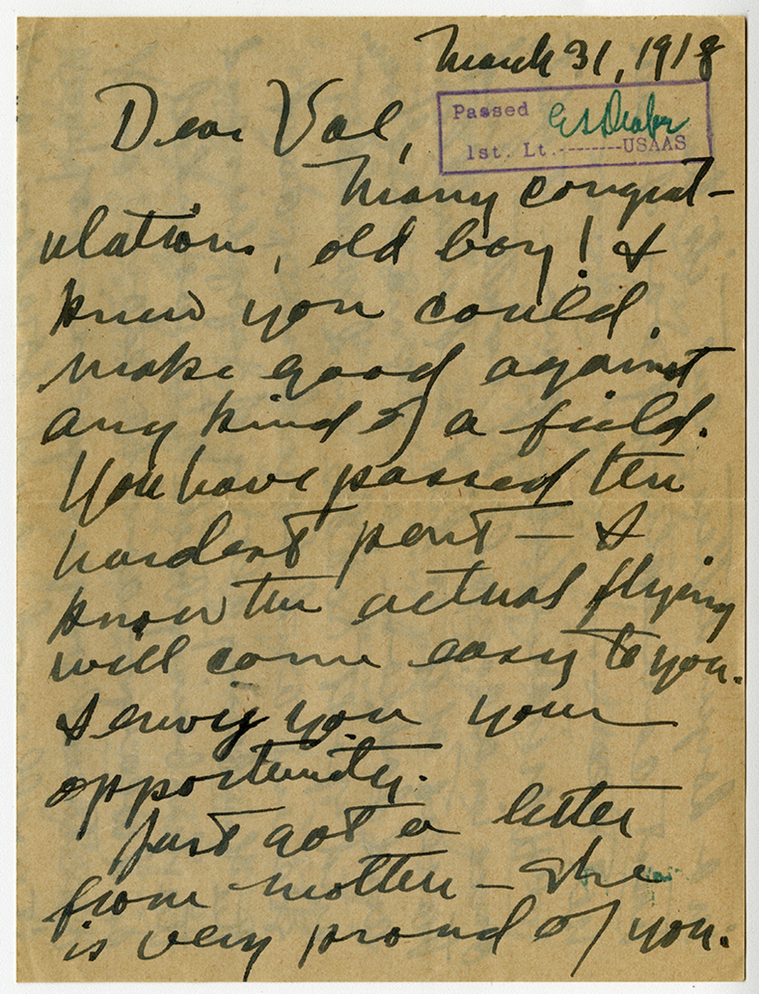 March 31, 1918 Dear Val, [censor’s stamp] Many congratulations, old boy! I knew you could make good against any kind of a field. You have passed the hardest part I know the actual flying will come easy to you. I envy you your opportunity. Just got a letter from Mother she is very proud of you.