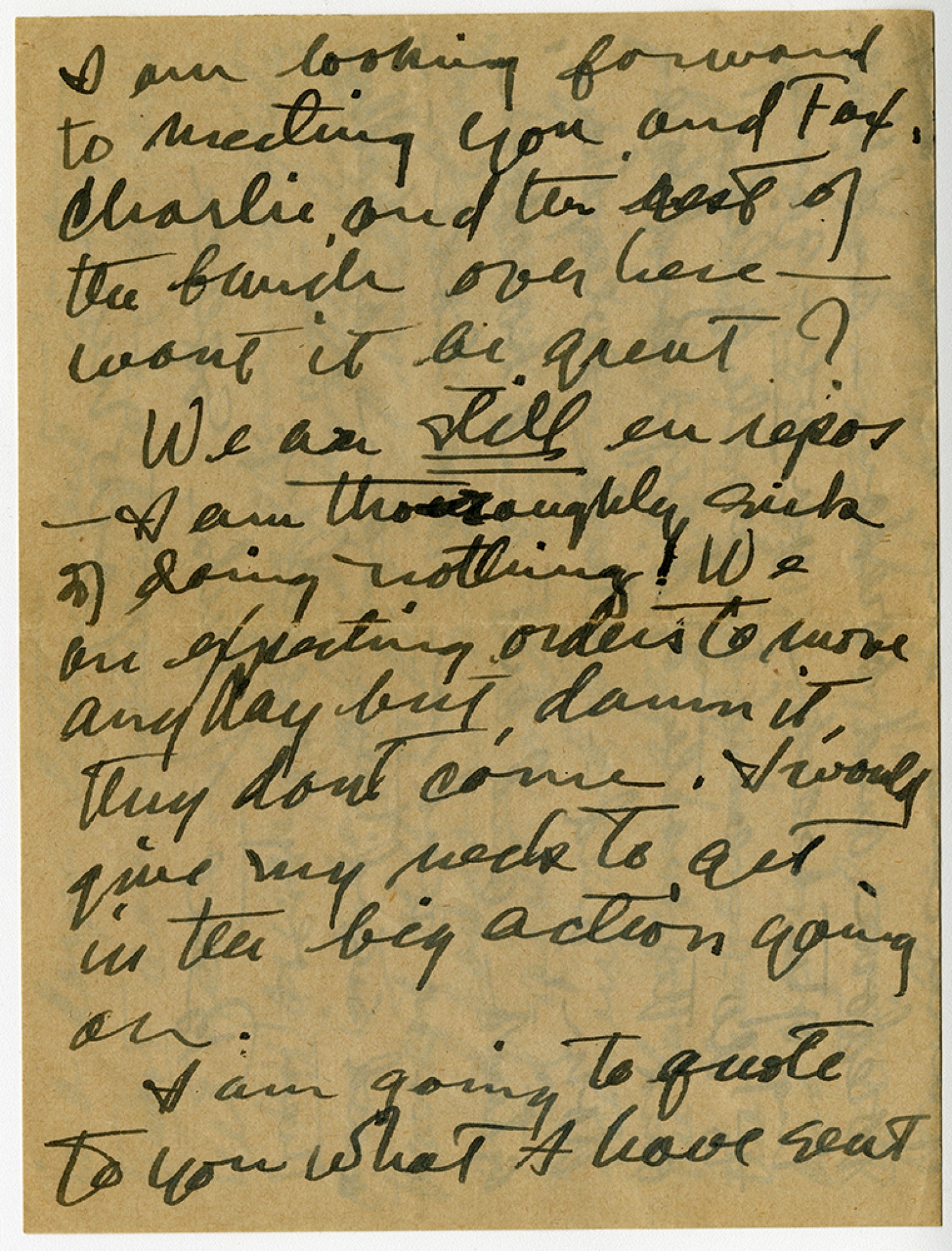 I am looking forward to meeting you and Fax. Charlie and the rest of the bunch over here won't it be great? We are still en repos I am thoroughly sick of doing nothing. We are expecting orders to move any day but, damn it, they don't come. I would give my neck to get in the big action going on. I am going to quote to you what I have sent