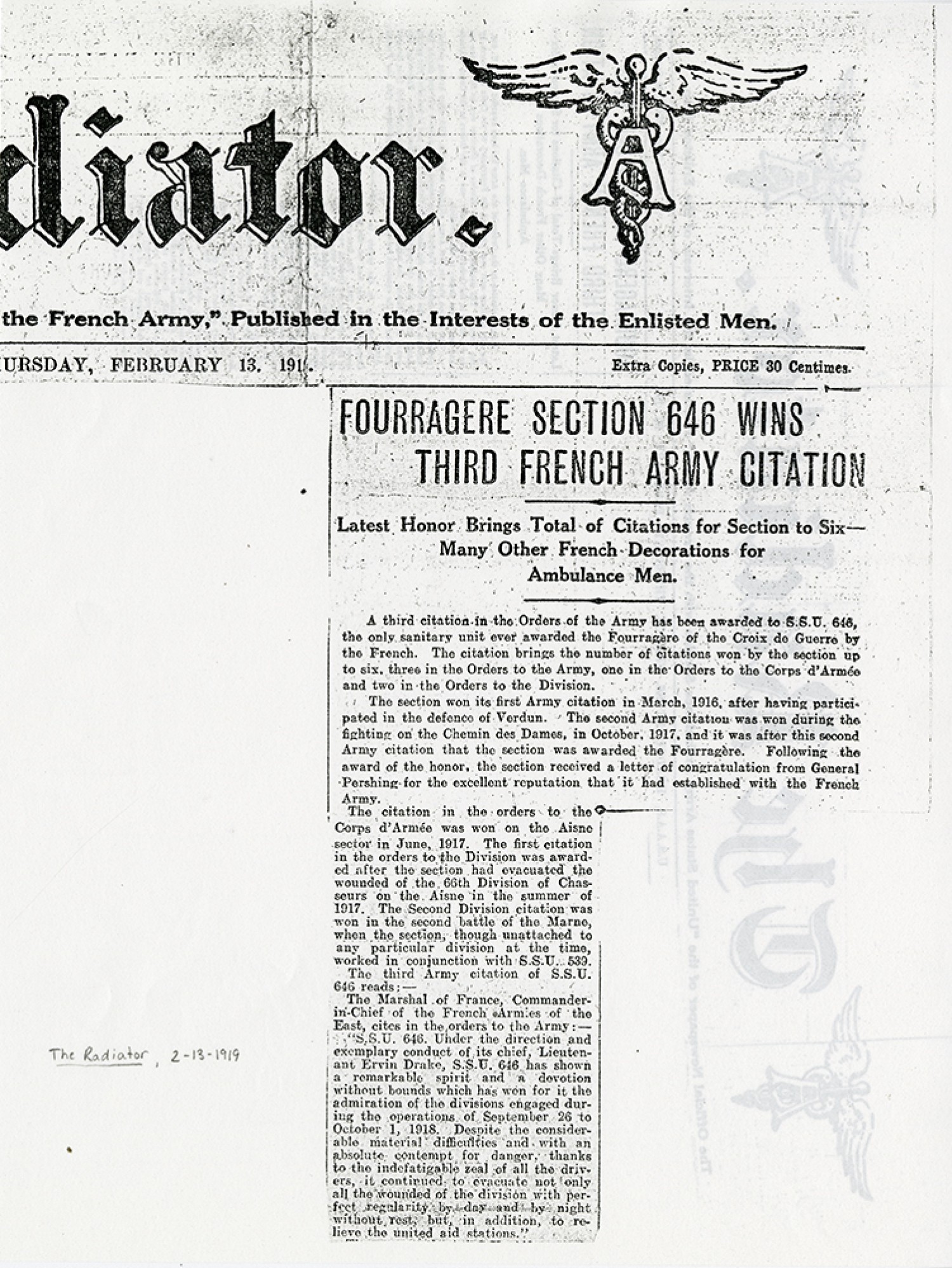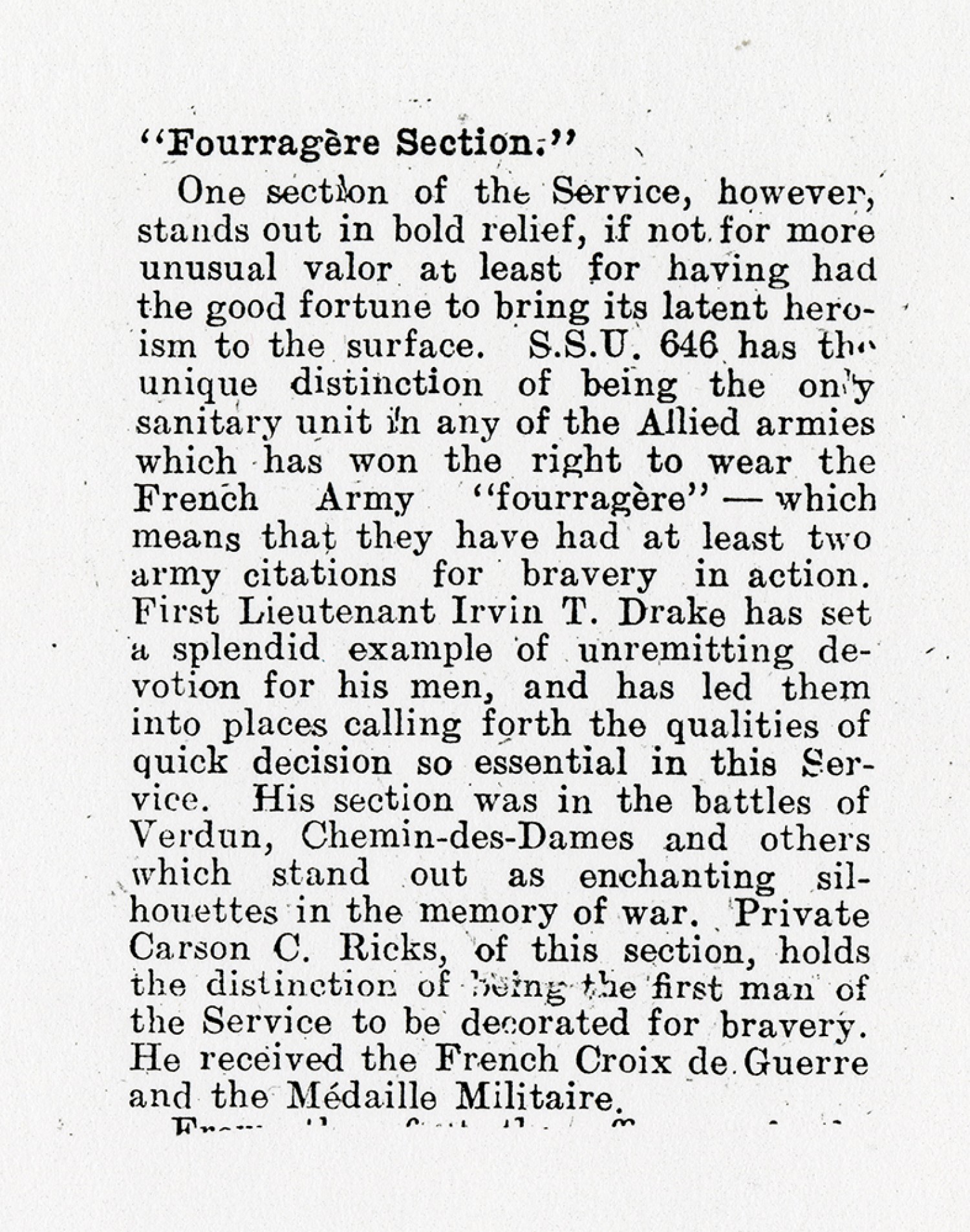 [Newspaper clipping] ”Fourragere Section 646 Wins Third French Army Citation”