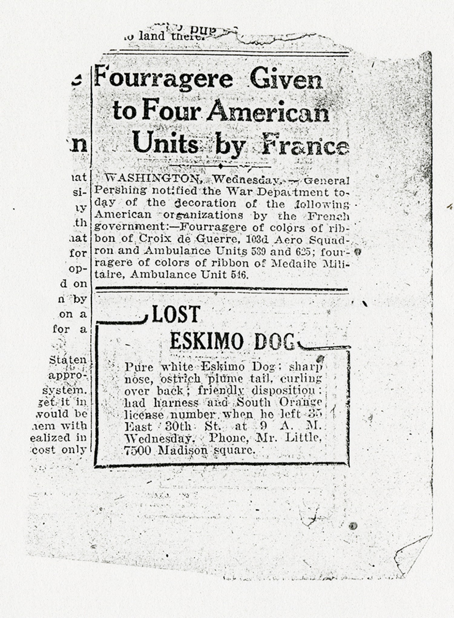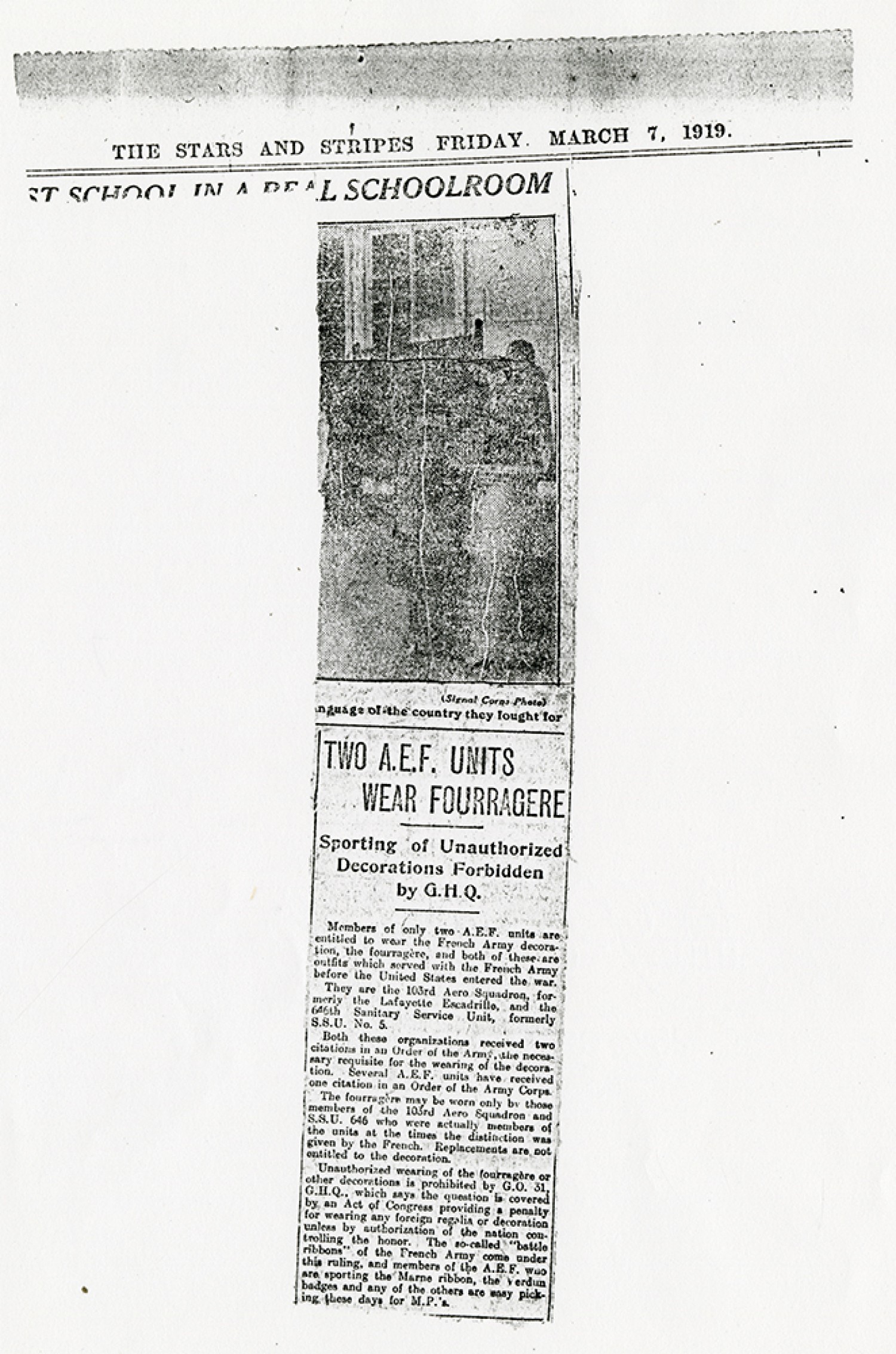 [Newspaper clipping] “Two A.E.F. Units Wear Fourragere”