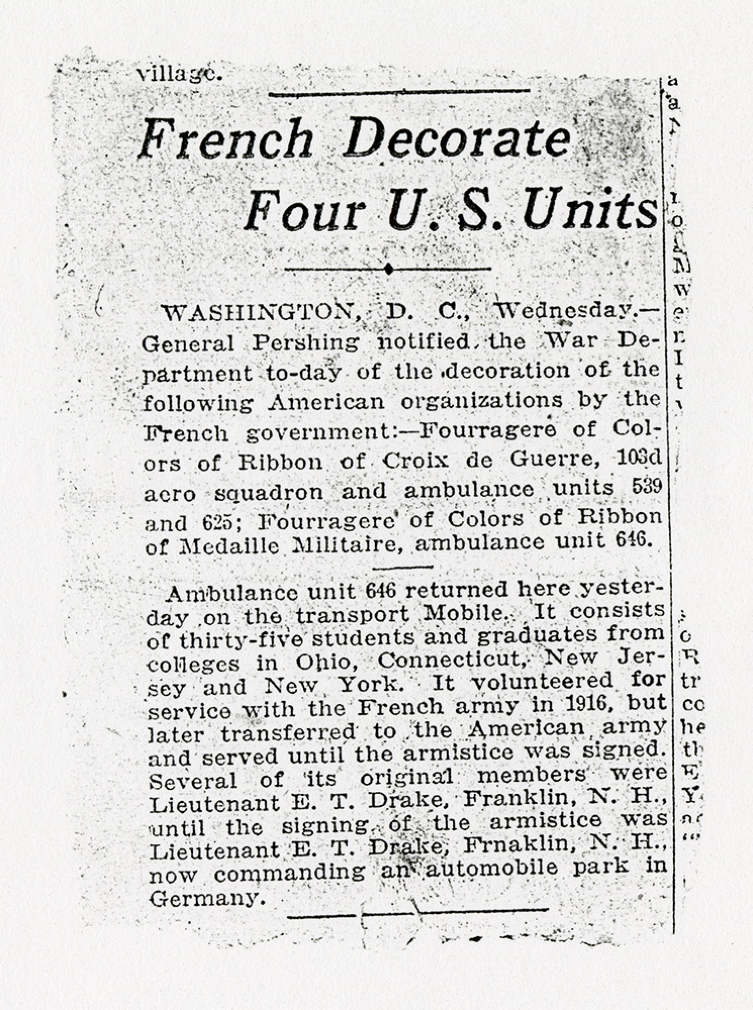 [Newspaper clipping] “French Decorate Four U.S. Units”