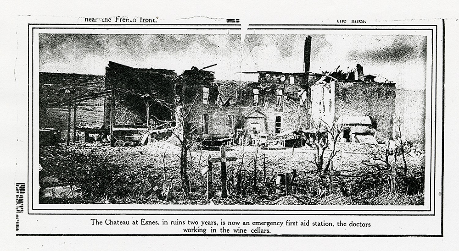 [Newspaper photograph] “The Chateau at Esnes, in ruins two years, is now an emergency first aid station, the doctors working in the wine cellars.”