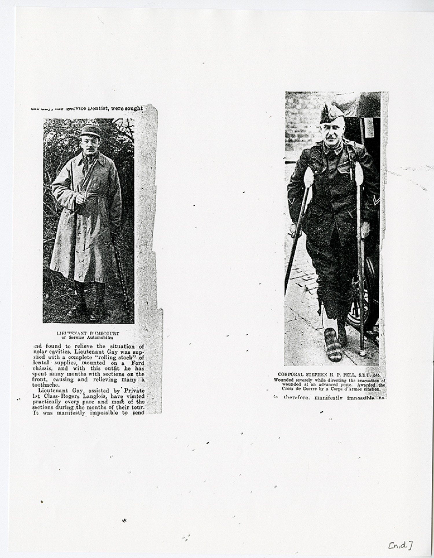 [Newspaper clipping and photographs] “Lieutenant D’Imecourt” “Corporal Stephen H. P. Pell, S.S.U. 646.