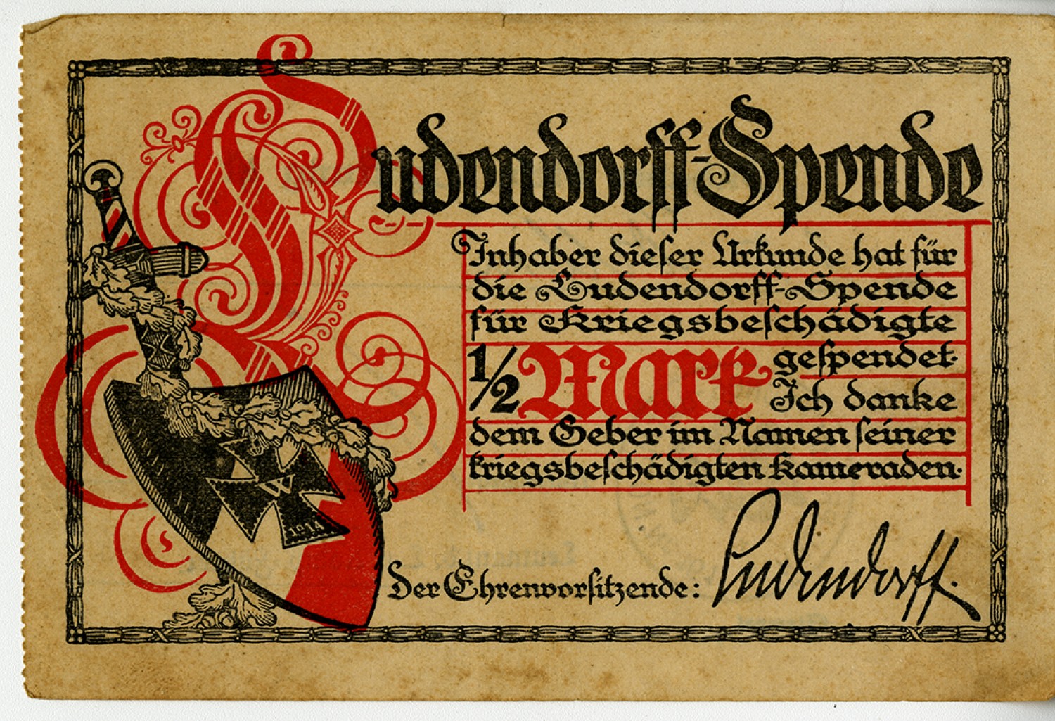 LUDENDORFF CONTRIBUTION Holder of this document has spend ½ Mark for the Ludendorff contribution regarding the War Injured I thank the donor in the name of the war injured comrades. Signed LUDENDORF