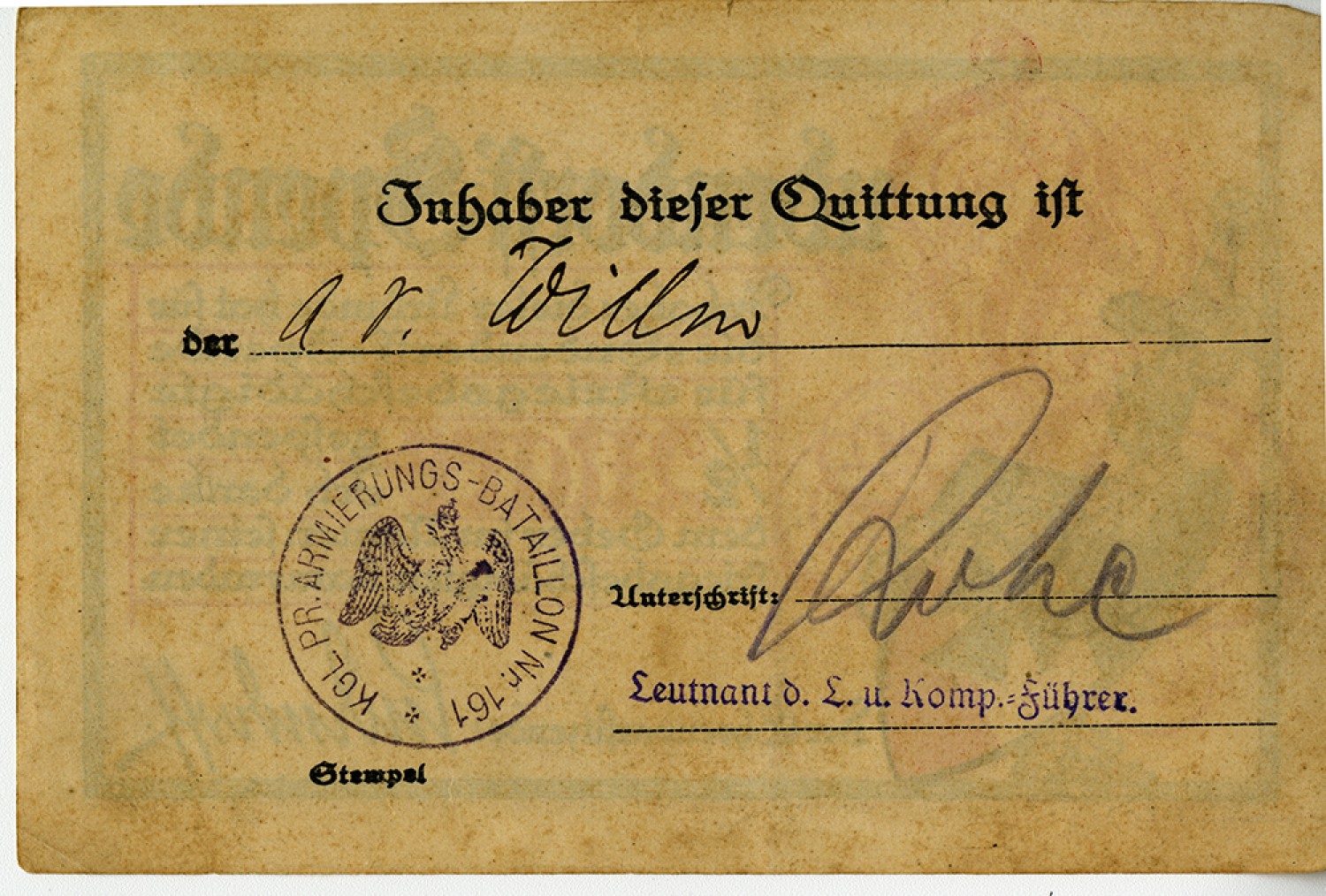THE HOLDER OF THIS RECEIPT IS A. V.Willm Signed Ruch Lieutenant Company Leader Armoured Batallion No 161