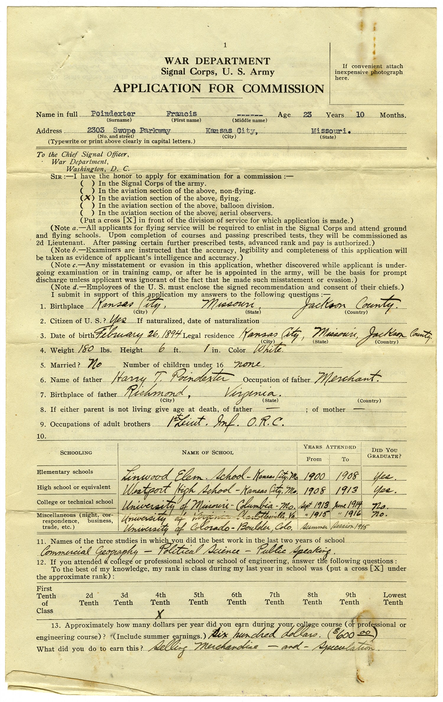 [page 1] War Department Signal Corps, U.S. Army Application for Commission If convenient attach inexpensive photograph here. Name in full Poindexter Francis [No Middle Name] Age 23 Years 10 Months. Address 2303 Swope Parkway Kansas City, Missouri. (Typewrite or print above clearly in capital letters.) To the Chief Signal Officer, War Department, Washington, D.C. Sir:- I have the honor to apply for examination for a commission:-(x) in the aviation section of the above, flying. (Note a.- All applicants for flying service will be required to enlist in the Signal corps and attend ground and flying schools. Upon completion of courses and passing prescribed test, they will be commissioned as 2d Lieutenant. After passing certain further prescribed tests, advanced rank and pay is authorized.) (Not b.- Examiners are instructed that the accuracy, legibility and completeness of this application will be taken as evidence of applicant