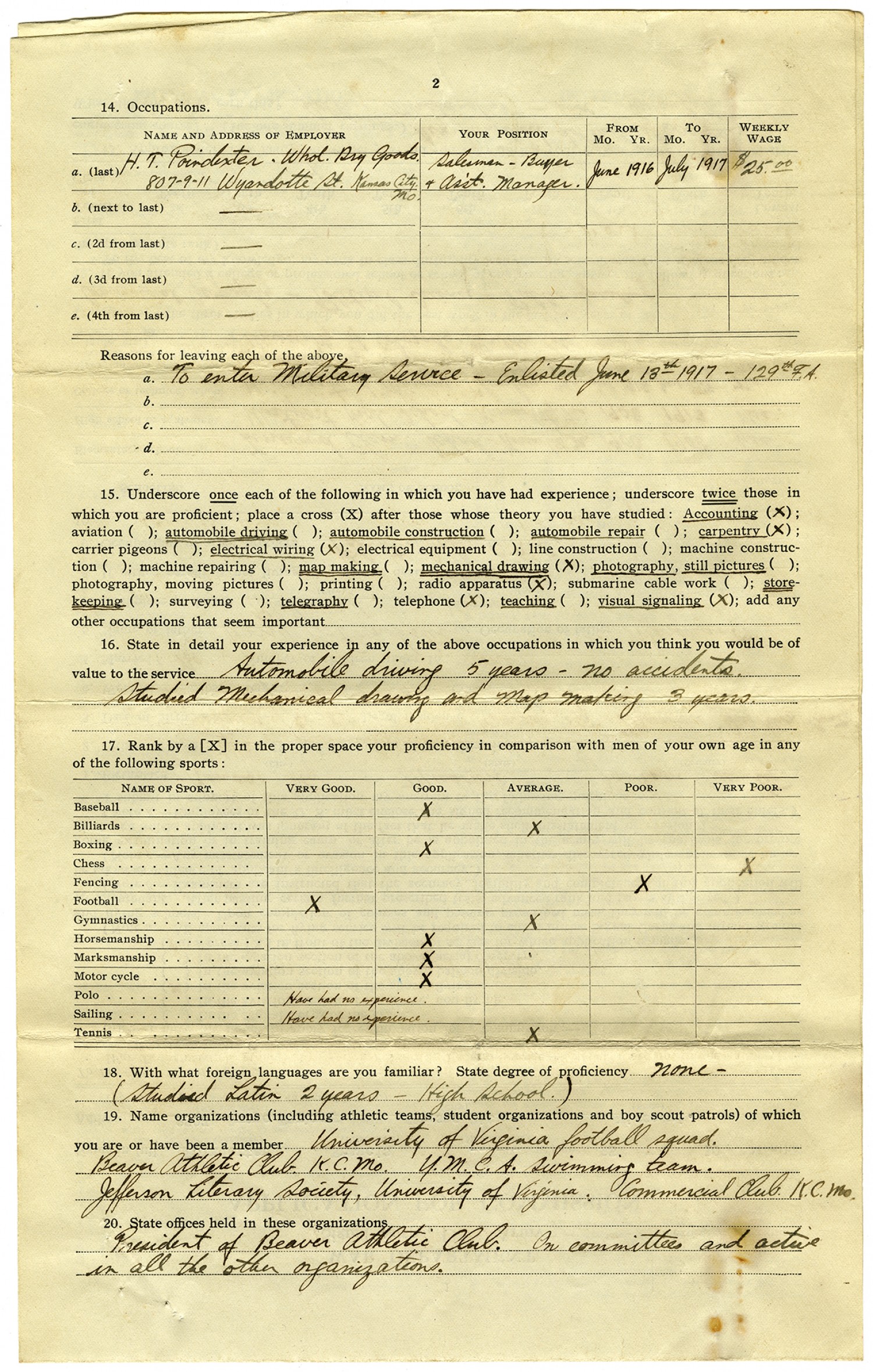[page 2] 14. Occupations a. (last)[Names and Address of Employer] H.t. Poindexter. Whole Dry Goods. 807-9-11 Wyandotte St. Kansas City, [Missouri] [Your Position] Salesman-Buyer & asst. Manager [ From Mo.Yr.] June 1916 [To Mo.Yr.] July 1917 [Weekly Wage] $25.00 Reasons for leaving each of the above. a. To enter Military Service- Enlisted June 13th 1917- 129th Field Artillery. 15. Underscore once each of the following in which you have had experience; underscore twice those in which you are proficient; place a cross (X) after those whose theory you have studied: Accounting (X) [underscored once]; aviation [NA]; automobile driving [underscored twice; automobile construction [underscored once]; automobile repair [underscored once]; carpentry (X) [underscored once]; carrier pigeons [NA]; electrical wiring (X)[underscored once; electrical equipment [NA]; line construction [NA]; machine construction [NA]; machine repairing [NA]; map making[underscored twice]; mechanical drawing (X)[underscored twice]; photograph, still pictures[underscored once]; photography, moving pictures [NA]; printing [NA]; radio apparatus(X); submarine cable work [NA]; storekeeping[underscored twice]; surveying [NA]; telegraphy[underscored once]; telephone (X); teaching[underscored once]; visual signaling (X) [underscored once]; add any other occupation that seem important 16. State in detail your experience in any of the above occupations in which you think you would be of value to the service Automobile driving 5 years- no accidents. Studied Mechanical drawing and Map making 3 years. 17. Rank by a [X] in the proper space your proficiency in comparison with men of your own age in any of the following sports: [Name of Sport] Baseball [Good] X [Name of Sport] Billiards [Average] X [Name of Sport] Boxing [Good] X [Name of Sport] Chess [Very Poor] X [Name of Sport] Fencing [Poor] X [Name of Sport] Football [Very Good] X [Name of Sport] Gymnastics [Average] X [Name of Sport] Horsemanship [Good] X [Name of Sport] Marksmanship [Good] X [Name of Sport] Motor cycle [Good] X [Name of Sport] Polo Have no experience [Name of Sport] Sailing Have no experience [Name of Sport] Tennis [Average] X 18. With what foreign languages are you familiar? State degree of proficiency none-(Studied Latin 2 years-High School) 19. Name organizations (including athletic teams, student organizations and boy scout patrols) of which you are or have been a member University of Virginia football squad. Beaver Athletic Club. [Kansas City, Missouri]. Y.M.C.A. swimming team. Jefferson Literary Society, University of Virginia. Commercial Club [Kansas City, Missouri] 20. State offices held in these organizations President of Beaver Athletic Club. ON committees and active in all the other organizations.