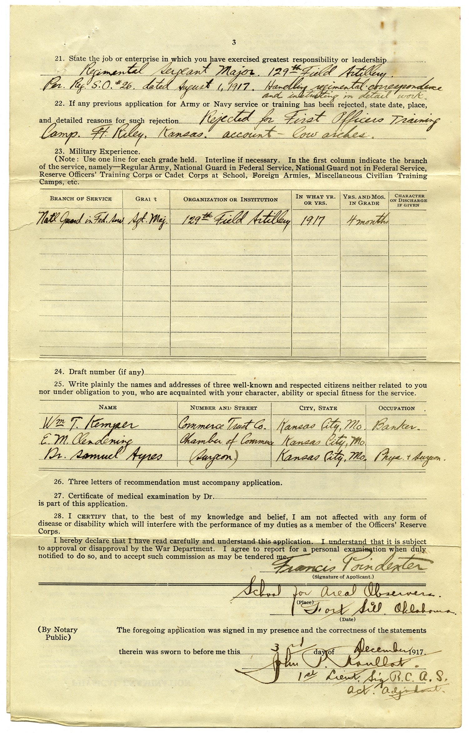 | Source | Poindexter, Francis. Application for Commission. 03 December 1917. Poindexter, Francis Collection. 84.17. The National World War I Museum, Kansas City, Missouri. |