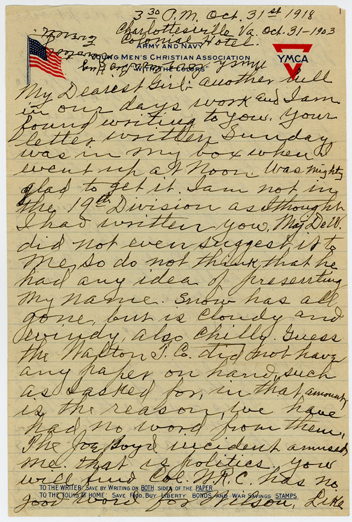 [Y.M.C.A. letterhead] 3 30 P.M. [October] 31st 1918 Charlottesville Va. [October] 31 – 1903 Colonial Hotel. My Dearest Girl : - Another lull in our days work and Iam found writing to you. Your letter written Sunday was in My box when I went up at Noon. Was Mighty glad to get it. Iam not in the 19th Division as Ithought Ihad written you. Maj. DeW. did not even suggest it to Me, so do not think that he had any idea of presenting My name. Snow has all gone but is Cloudy and windy, Also Chilly. Guess the Walton F. Co. did not have any paper on hand, such as Iasked for, in that amount is the reason we have had no word from them. The Joe Boyd incident amused me. That is politics you will find Col. W.R.C. has no good word for Wilson, Like [written upside down in top margin] Much love and Big Hug Devotedly Everett.