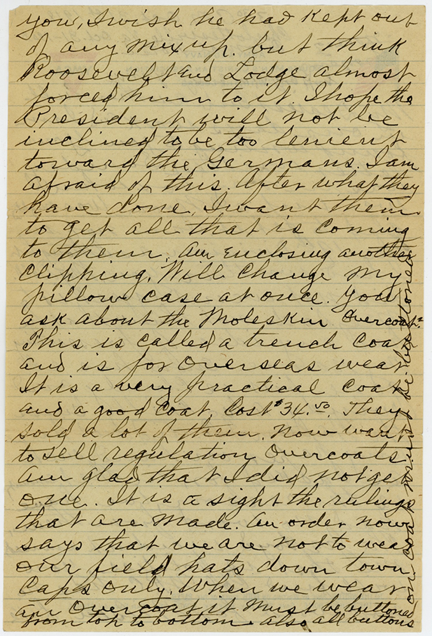 you, Iwish he had Kept out of any Mix up, but think Roosevelt and Lodge almost forced him to it. Ihope the President will not be inclined to be too lenient toward the Germans. Iam afraid of this. After what they have done, Iwant them to get all that is Coming to them. Am Enclosing another Clipping. Will Change My pillow Case at once. You ask about the Moleskin Overcoat? This is Called a trench Coat and is for Overseas wear. It is a very practical Coat and a good Coat. Cost $34.50. They sold a lot of them. Now want to sell regulation Overcoats. Am glad that Idid not get one. It is a sight the rulings that are Made. An order now says that we are not to wear our field hats down town Caps only. When we wear an Overcoat it Must be buttoned from top to bottom. Also all buttons [written vertically in left margin] on Coat must be buttoned.