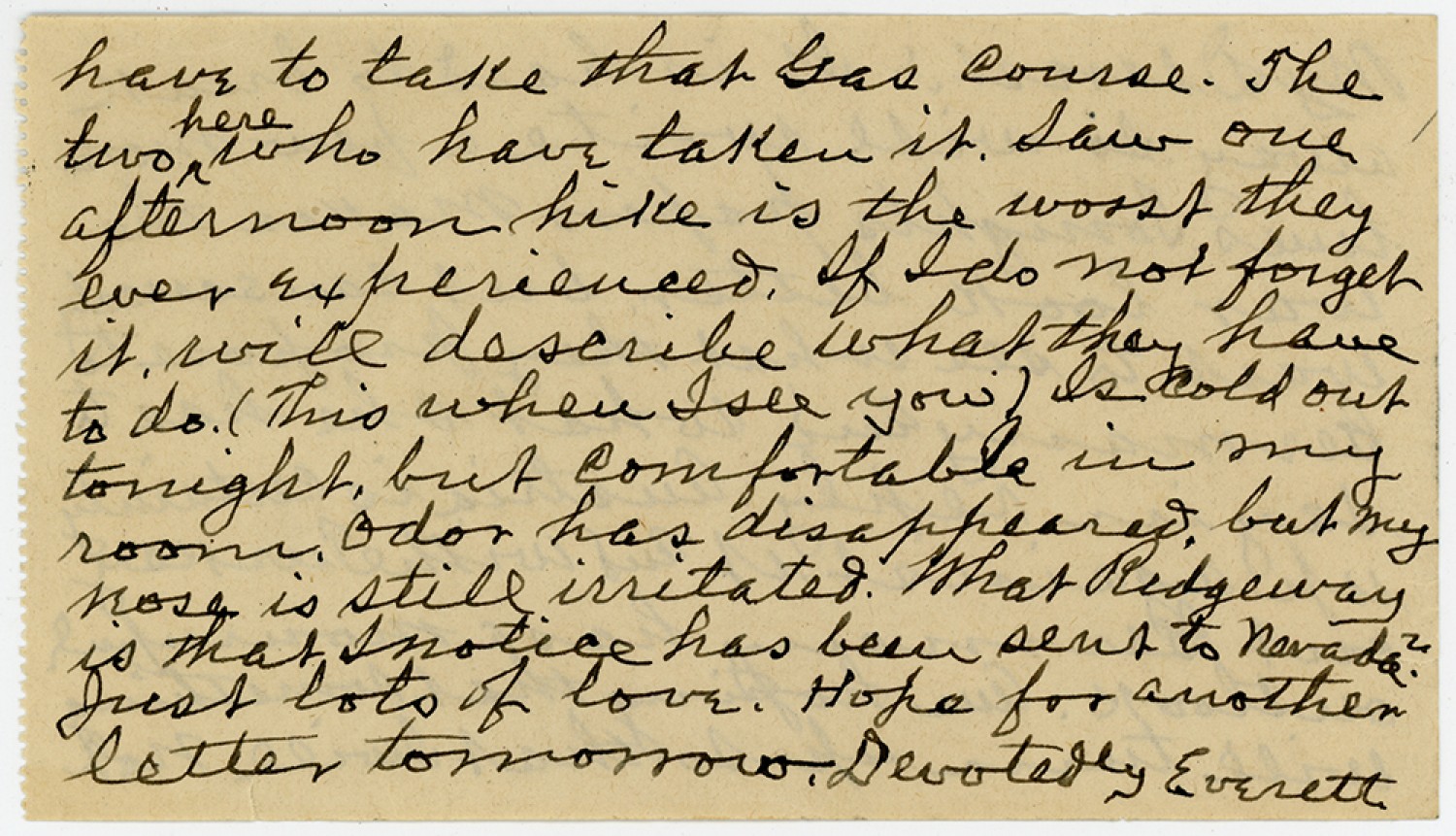 have to take that Gas Course. The two here who have taken it. Saw one afternoon hike is the worst they ever Experienced. If Ido not forget it will describe what they have to do. (This when Isee you) Is Cold out tonight, but Comfortable in My room. Odor has disappeared but my nose is still irritated. What Ridgeway is that Inotice has been sent to Nevada? Just lots of love. Hope for another letter tomorrow. Devotedly Everett