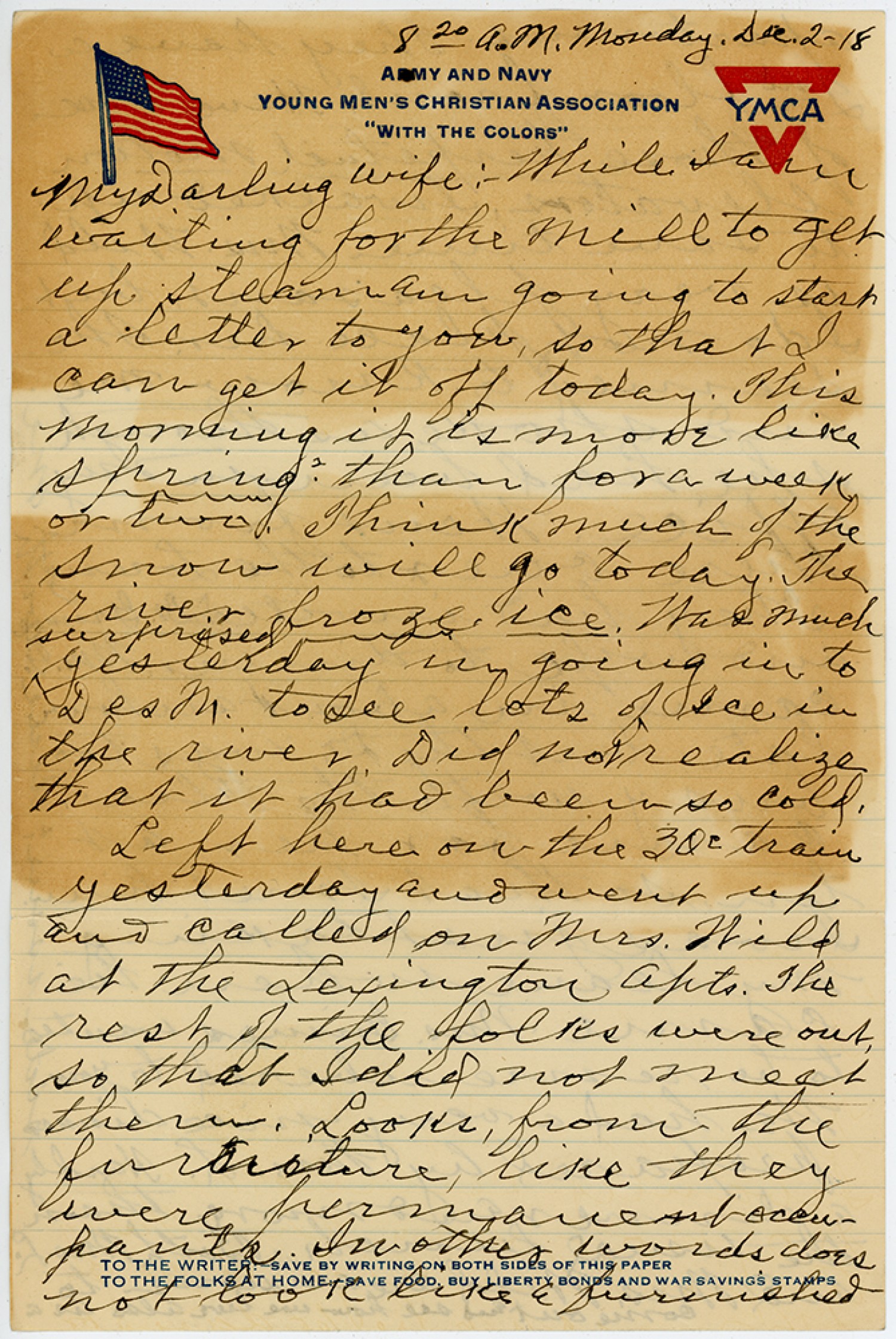 [American Y. M. C. A. letterhead] 8:20 A. M. Monday [December 2, 1918] My Darling wife:- While I am waiting for the mill to get up steam am going to start a letter to you so that I can ger it off today. This morning it is more like spring: than for a week or two. I think much of the snow will go today. The river froze ice. Was much surprised yesterday in going to [Des Moines] to see lots of ice in the river. Did not realize that it has been so cold. Left here on the 3 0’C train yesterday and went up and called on Mrs. Wild at the Lexington Apts. The rest of the folks were out so that I did not meet them. Looks, from the furniture that they are permanent occupants. In other words does not look like a furnished