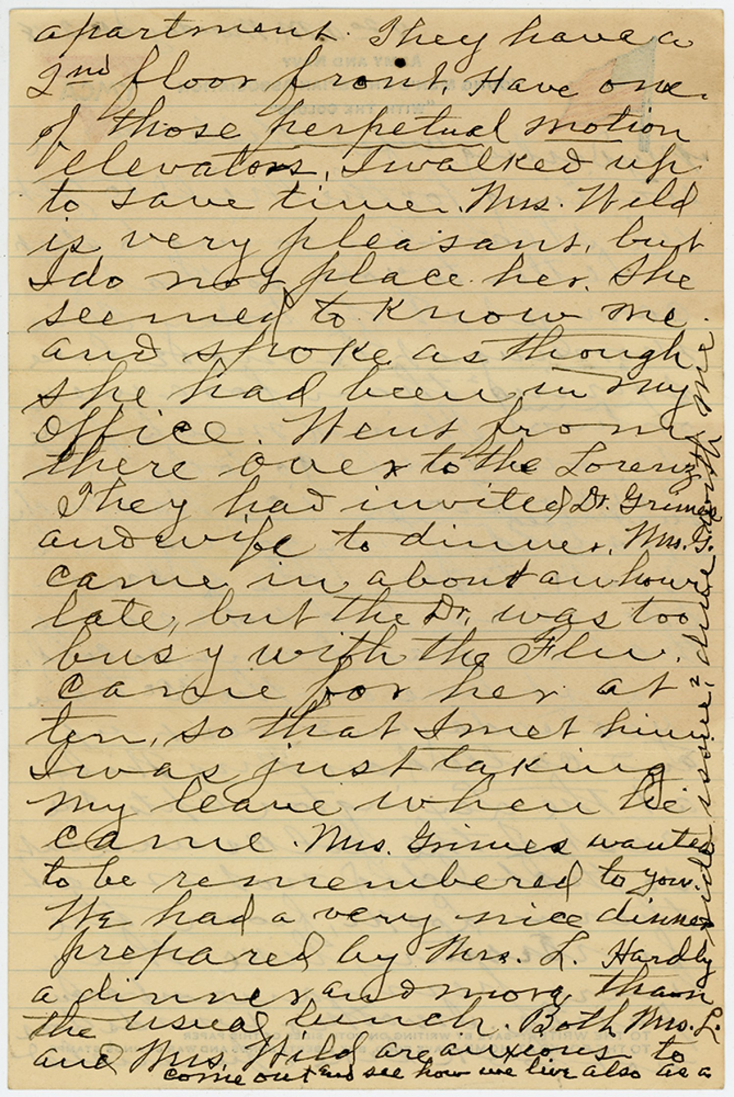 apartment. They have a 2nd floor front. Have one of those perpetual motion elevators. I walked up to save time. Mrs. Wild is very pleasant, but I do not place her. She seemed to know me and spoke as though she had been in my office. Went from there over to the Lorernz . They had invited Dr. Grimes and wife to dinner. Mrs. G. came in about an hour late, but the Dr. was too busy with the Flu. Came for her at ten, so that I met him. I was just taking my leave when he came. Mrs. Grimes wanted to be remembered to you. We had a vey nice dinner prepared by Mrs. L. Hardly a dinner and more than the usual lunch. Both Mrs. L. and Mrs. Wild are anxious to come out and see how we live also as a [written horizontally on page]: side issue [MS illegible: 1 word] with me