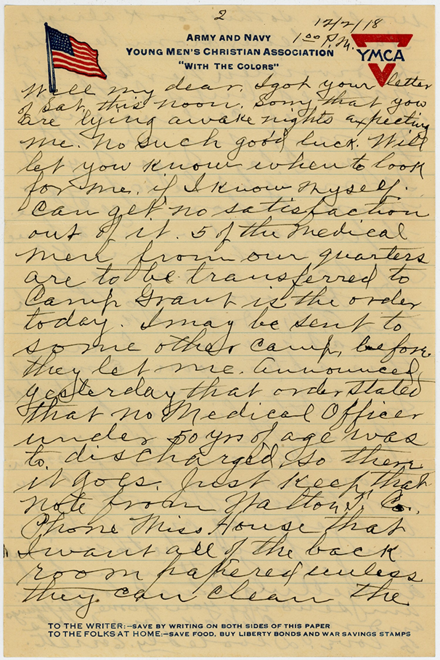 [American Y. M. C. A letterhead] [December 12, 1918] 1:00 P.M. Well my dear, I got your letter of Sat, this noon. Sorry that you are lying awake nights expecting me. No such good luck. Will let you know when to look for me. If I know myself. Can get no satisfaction out of it 5 of the medical men from our quarters are to be transferred to Camp Grant [Illinois] is the order today. I may be sent to some other camp before they let me. Announced yesterday that order states that No Medical Officer under 50 yrs of age was to discharged so there it goes. Just keep that note from Walton J. Co. Phone Miss House that I want all of the back room papered unless they can clean the