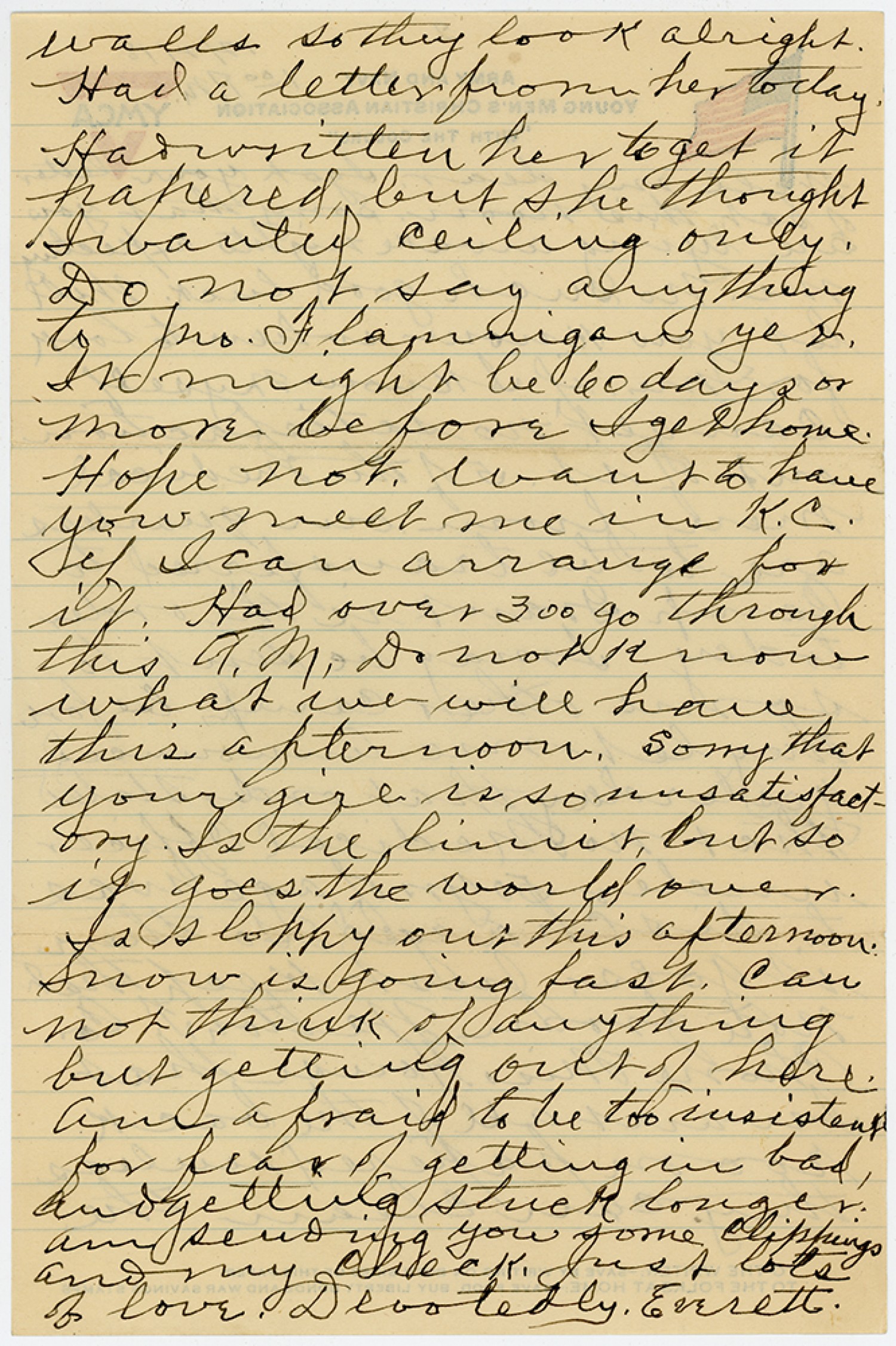 walls so they look alright. Had a letter from her today. Had written her to get it papered but she thought I wanted ceiling only. Do not say anything to Ms. Flannigan yet. It might be 60 days or more before I get home. Hope not. Want to have you meet me in [Kansas City] if can arrange for it. Had over 300 go through this A.M. Do not know what we will have this afternoon. Sorry that your girl is so unsatisfactory. Is the limit, but so it goes the world over. Is sloppy out this afternoon. Snow is going fast. Can not think of anything but getting out of here. Am afraid to be too insistent for fear of getting in bad and getting stuck longer : am sending you some clippings and my check. Just lots of love. Devotedly, Everett