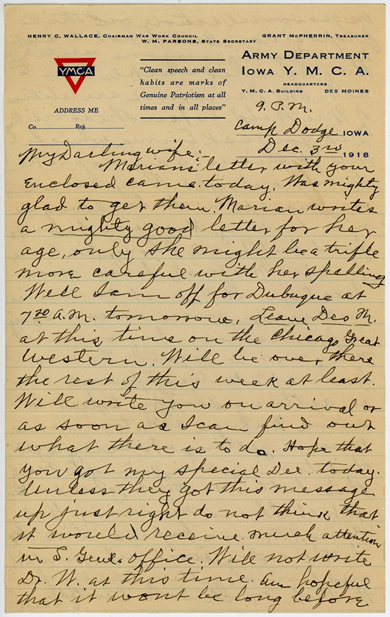 [American Y. M. C. A. letterhead] 9 P. M. Camp Dodge, Iowa [December] 3rd 1918 My Darling wife:- Marians’ letter with your enclosed came today. Was mighty glad to get them. Marian writes a mighty good letter for her age, only she might be a trifle more careful with her spelling. Well I am off for Dubuque at 7:20 a. m. tomorrow. Leave [Des Moines] at this time on the Chicago Great Western. Will be over there the rest of this week at least. Will write you on arrival or as soon as I can find out what there is to do. Hope that you got my special Del. today. Unless they got this message up just right do not think that it would receive much attention in [Surgeon Generals] Office. Will not write Dr. W. at this time am hopeful that it won’t be long before