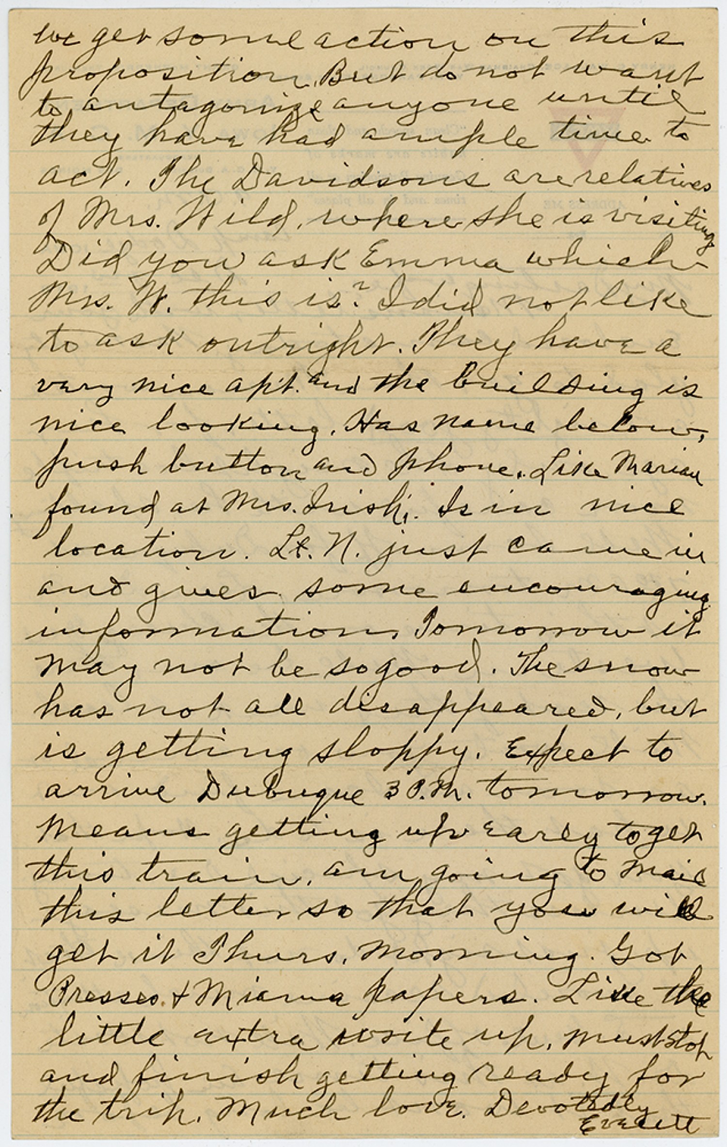 we get some action on this proposition.But do not want to antagonize anyone until they have had ample time to act. The Davidsons are relatives of Mrs. Wild where she is visiting. Did you ask Emma which Mrs. W. this is? I did not like to ask outright. They have a very nice apt. and the building is nice looking. Has name below push button and Inhome. Like Marian found at Mrs. Irish. Is in nice location. Lt. N. just came in and gives some encouraging information. Tomorrow it may not be so good. The snow has not all disappeared, but is getting sloppy. Expect to arrive Dubuque 3P.M. tomorrow. Means getting up early to get this train, am going to mail this letter so that you will get it Thurs. morning. Got Pressco and [MS inelligible: 1 word] papers. Like the little extra write up. Must stop and finish getting ready for the trip. Much love. Devotedly Everett.