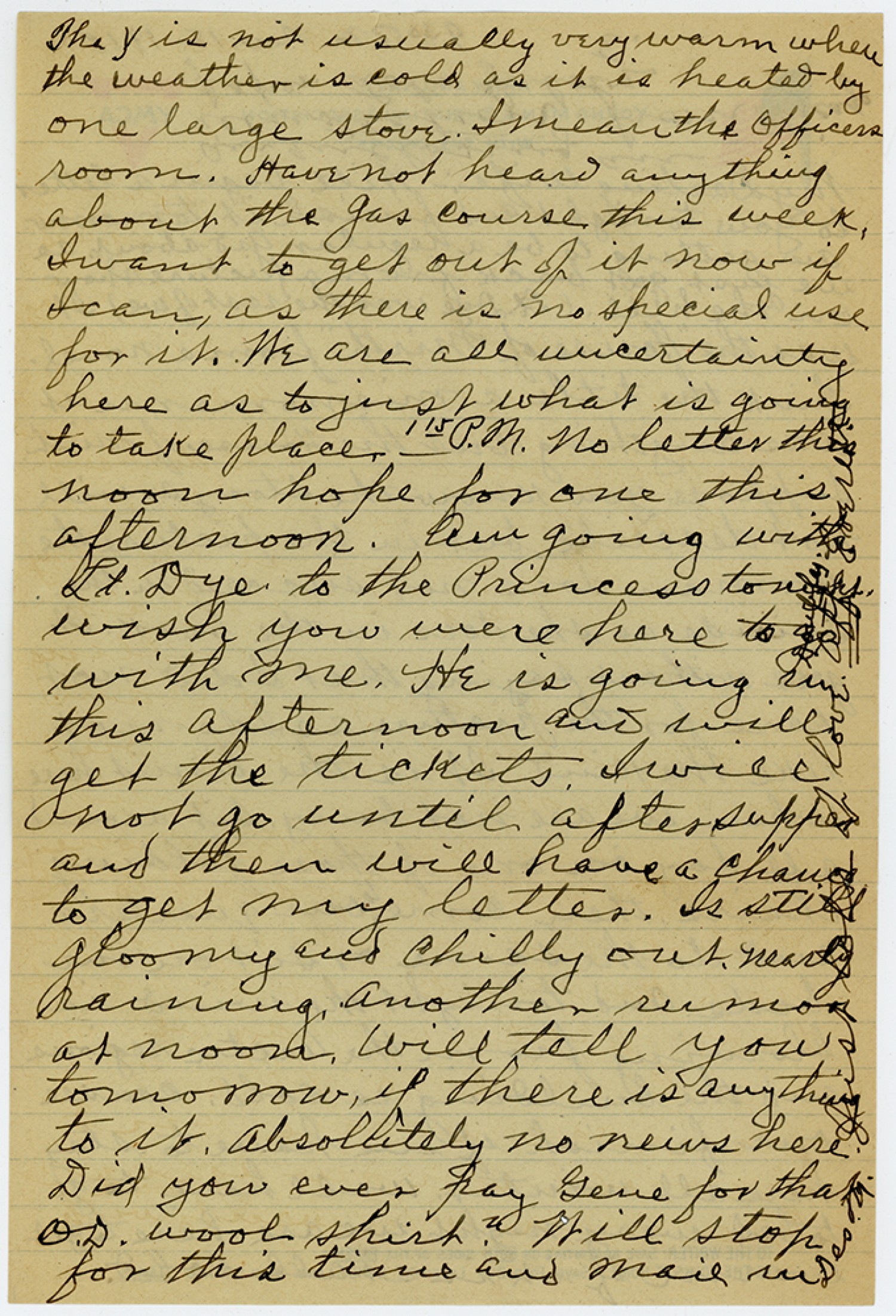 The Y is not usually very warm when the weather is Cold as it is heated by one large stove. Imean the Officers room. Have not heard anything about the gas Course this week. Iwant to get out of it Now if Ican, as there is no special use for it. We are all uncertainty here as to just what is going to take place. 1 15 P.M. No letter this noon hope for one this afternoon. Am going with Lt. Dye to the Princess tonight. wish you were here to go with me. He is going this afternoon and will get the tickets. Iwill not go until after supper and then will have a Chance to get my letter. Is still gloomy and Chilly out, Nearly raining, Another rumor at noon. Will tell you tomorrow, if there is anything to it. Absolutely No News here. Did you ever pay Gene for that O.D. wool shirt? Will stop for this time and Mail in [written in right margin] [Des Moines] Just lots of love Aff. Everett