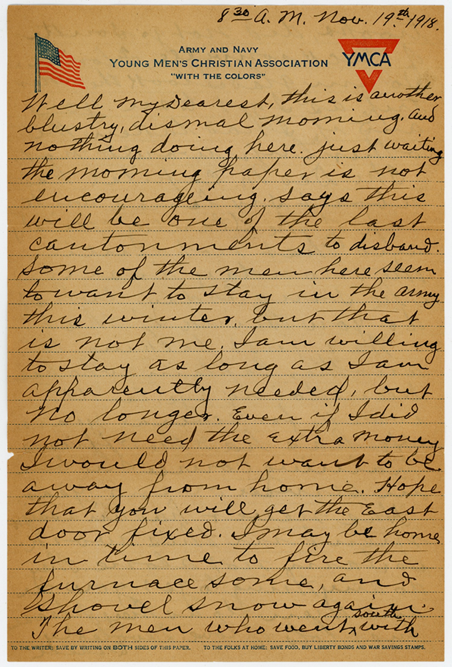 8 30 A.M. [November] 19th 1918. Well MyDearest, this is another blustry, dismal Morning, and Nothing doing here, just waiting the morning paper is not encouraging, says this will be one of the last Cantonments to disband. Some of the men here seem towant to stay in the Army this winter, but that is not me. Iam willing tostay as long as Iam apparently needed, but No longer. Even if Idid not need the Extra Money Iwould not want to be away from home. Hope that you will get the East door fixed. Imay be home in time to fire the furnace some, and shovel snow again. The Men who went south with
