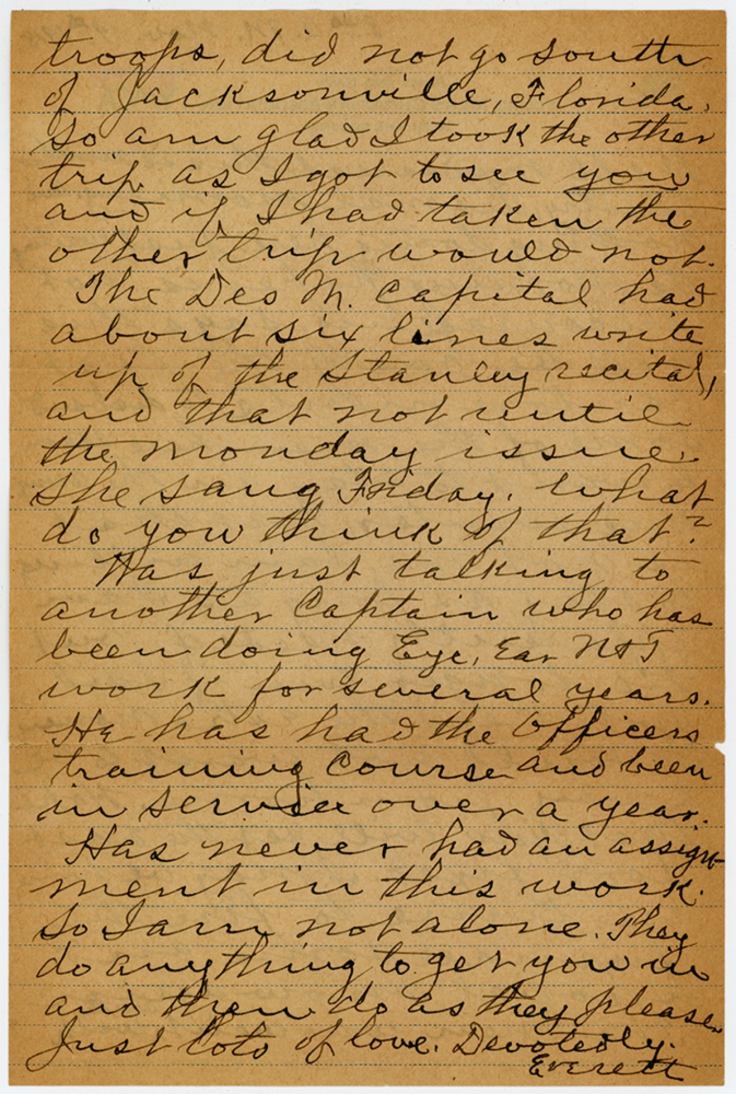 troops, did Not go South of Jacksonville, Florida. So am glad Itook the other trip as Igot tosee you and if Ihad taken the other trip would not. The [Des Moines] Capital had about Six lines write up of the Stanley recital, and that Not until the Monday issue, She Sang Friday. What do you think of that? Was just talking to another Captain who has been doing Eye, Ear N&T work for Several years. He has had the Officers training Course and been in Service over a year. Has never had an assignment in this work. So Iam not alone. They do anything to get you in and then do as they please. Just lots of love. Devotedly, Everett