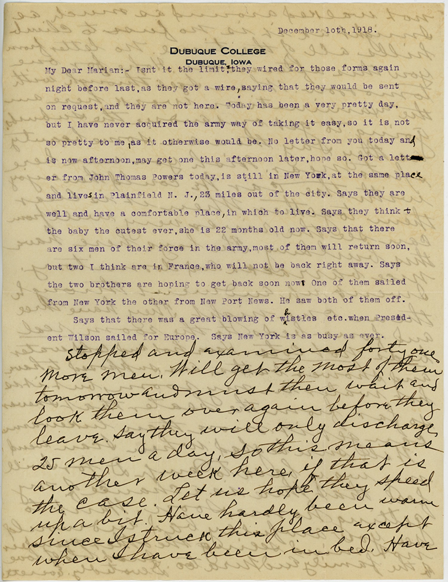 [Dubuque College Dubuque, Iowa letterhead] December 10, 1918 My Dear Marian:- Tent it the limit: they wired for those forms again night before last as they got a wire, saying that they would be sent on request , and they are not here. Today has been a very pretty day, but I have never acquired the army way of taking it easy, so it is not so pretty to me, as it otherwise would be. No letter from you today and is now afternoon, may get one this afternoon later, hope so. Got a letter from John Thomas Powers today, is still in New York, at the same place and lives in Plainfield [New Jersey], 23 miles out of the city. Says they are well and have a comfortable place, in which to live. Says they think the baby the cutest ever, she is 22 months old now. Says that there are six men of their force in the army, most of them will return soon , but two I think are in France, who will not be back right away. Says the two brothers are hoping to get back soon now. One of them sailed from New York the other from New Port News. He saw both of them off. Says that there was a great blowing of whistles etc. when President Wilson sailed for Europe. Says New York is as busy as ever. Stopped and examined forty one more men. Will get the most of them tomorrow and must then wait and look them over again before they leave. Say they will only discharge, 25 men a day, so this means another week here if that is the case. Let us hope they speed up a bit. Have hardly been warm since I struck this place except when I have been in bed. Have