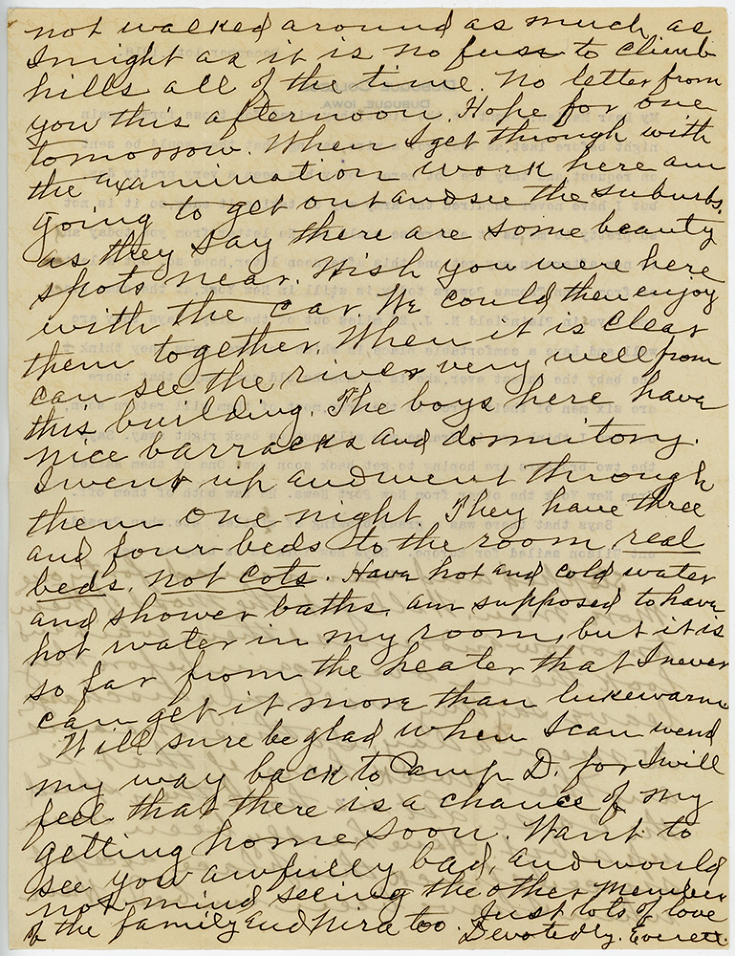 not walked around as much as I might as it is no fuss to climb hills all of the time. No letter from you this afternoon. Hope for one tomorrow. When I get through with the examination work here am going to get out and see the suburbs . As they say there are some beauty spots near. Wish you were here with the car. We could then enjoy them together.When it is clear can see the river very well from this building. The boys here have nice barracks and dormitory. I went up and went through them one night. They have three and four beds to the room real beds, not cots. Have hot and cold water and shower baths am supposed to have hot water in my room, but it is so far from the heater that I never can get it more than lukewarm. Will sure be glad when I can wind my way back to [Camp Dodge] for I will fell that there is a chance of my getting home soon. Want to see you awfully bad, and would not mind seeing the other members of the family and Nira too. Just lots of love Devotedly, Everett.