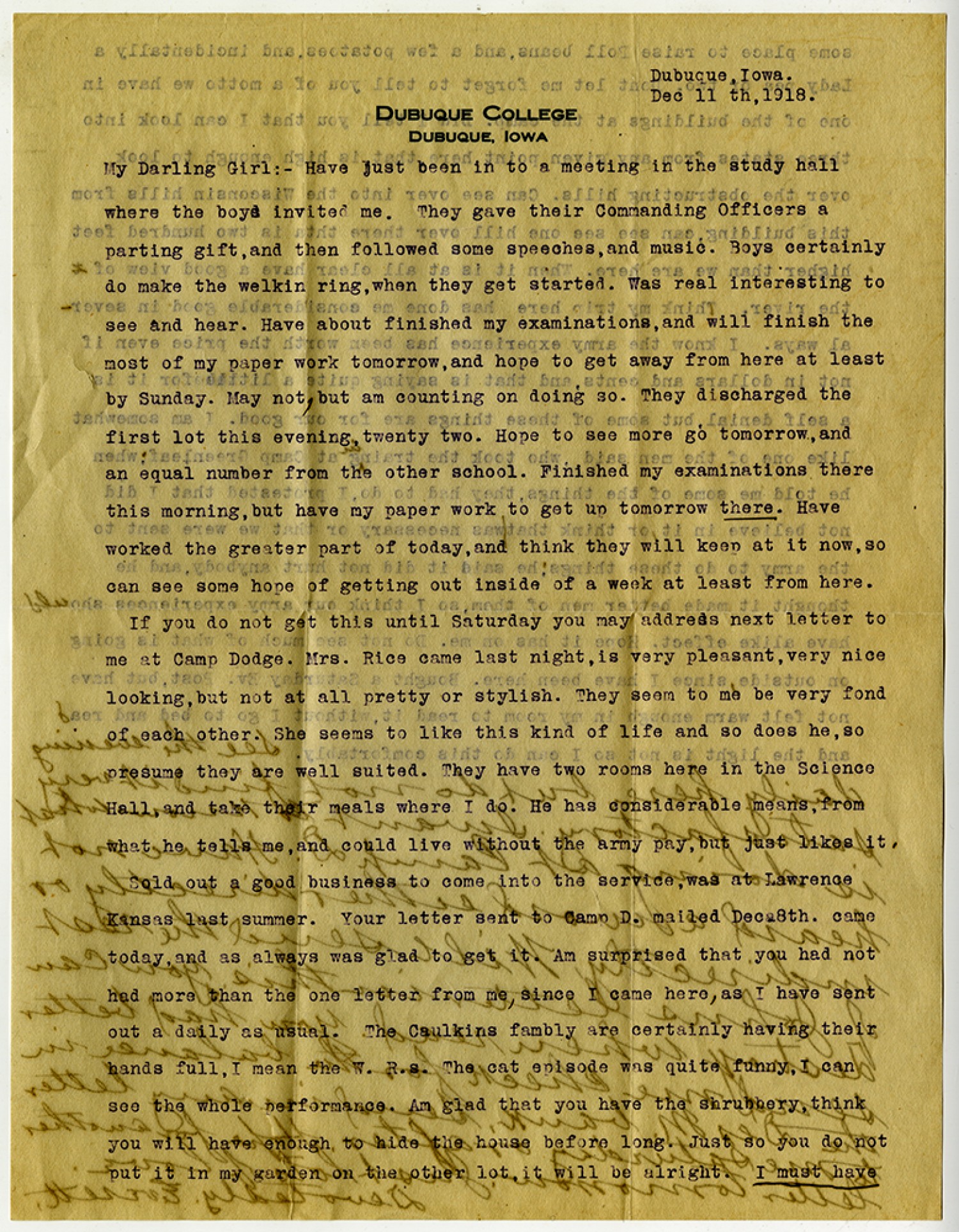 [Dubuque College Dubuque, Iowa letterhead] Dubuque. Iowa. [December] 11th, 1918. My Darling Girl:- Have just been in to a meeting in the study hall where the boys invited me. They gave their Commanding Officers a parting gift, and then followed some speeches, and music. Boys certainly do make the welkin ring, when they get started. Was real interesting to see and hear. Have about finished my examinantions, and will finish the most of my paper work tomorrow, and hope to get away from here at least by Sunday. May not, but am counting on doing so. They discharged the first lot this evening, twenty two. Hope to see more go tomorrow, and an equal number from the other school. Finished my examinations there this morning, but have paper work to get up tomorrow there. Have worked the greater part of today, and think they will keep at it now, so If you do not get this until Saturday you may address next letter to me at Camp Dodge. Mrs. Rice came last night, is very pleasant, very nice looking, but not at all pretty or stylish. They seem to me be very fond of each other. She seems to like this kind of life and so does he, so presume they are well suited. They have two rooms here in the Science Hall, and take their meals where I do. He has considerable means, from what he tells me, and could live without the army pay,but just likes it. Sold out a good business to come into the service,was at Lawrence Kansas last summer. Your letter sent to [Camp Dodge] mailed [December] 8th. came today, and as always was glad to get it. Am surprised that you had not had more than the one letter from me, since I came here, as I have sent out a daily as usual. The Caulkins family are certainly having their hands full, I mean the W. R.s. The cat episode was quite funny, I can see the whole performance. Am glad that you have the shrubbery,think you will have enough to hide the house before long. Just so you do not put it in my garden on the other lot, it will be alright. I must have