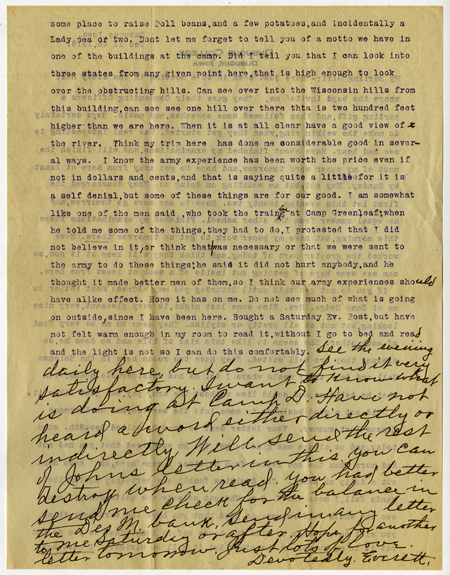 some place to raise Poll beans, and a few potatoes, and incidentally a Lady pea or two. Dont let me forget to tell you of a motto we have in one of the buildings at the camp. Did I tell you that I can look into three states from any given point here, that is high enough to look over the obstructing hills. Can see over into the Wisconsin hills from this building, can see see one hill over there thta is two hundred feet higher than we are here. Then it is all clear have a good view of the river. Think my trip here has done me considerable good in several ways. I know the army experience has been worth the price even if not in dollars and cents, and that is saying quite a little for it is a self denial, but some of these things are for our good. I am somewhat like one of the men said, who took the train at Camp Greenleaf:when he told me some of the things,they had to do, I protested that I did not believe in it, or think that was necessary or that we were sent to the army to do these things:he said it did not hurt anybody,and he thought it made better men of them, so I think our army experiences should have alike effect. Hope it has on me. Do not see much of what is going on outside, since I have been here. Bought a Saturday Ev. Post, but have not felt warm enough in my room to read it,without I go to bed and read and thelight is not so I can do this comfortably. See the evening daily hear, but do not find it very satisfactory. Iwant to know what is doing at [Camp Dodge]. Have not heard a word either directly or indirectly. Will send the rest of Johns letter in this you can destroy when read. You had better send me check for the balance in the [Des Moines] bank. Send in any letter to me Saturday or after. Hope for another letter tommorrow. Just Lots of Love. Devotedly. Everett.