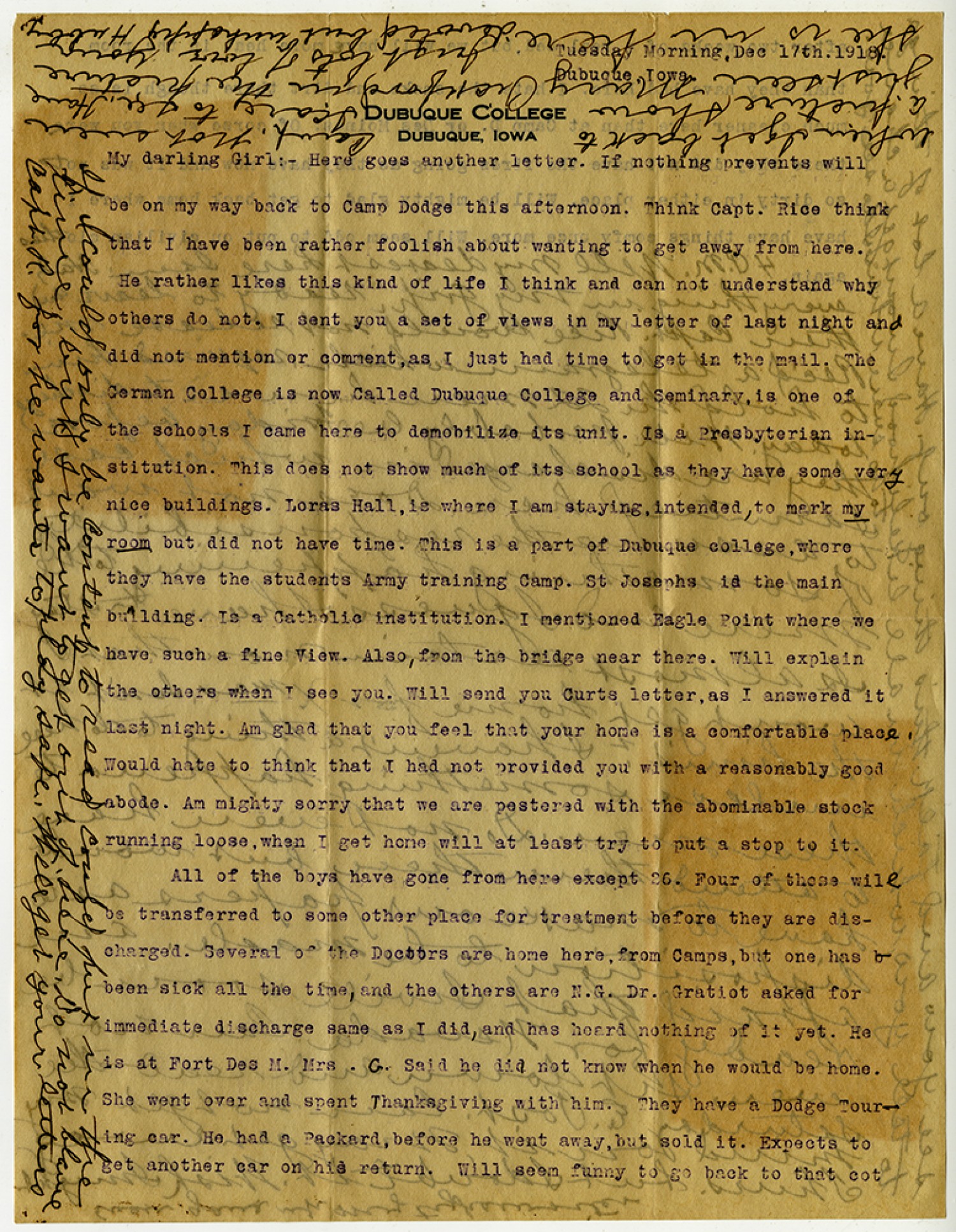 [Dubuque College Dubuque, Iowa letterhead] Tuesday Morning, [December] 17th, 1918. Dubuque, Iowa. My darling Girl:- Here goes another letter. If nothing prevents will be on my way back to Camp Dodge this afternoon. Think Capt. Rice think that I have been rather foolish about wanting to get away from here. He rather likes this kind of life I think and can not understand why others do not. I sent you a set of views in my letter of last night and did not mention or comment, as I just had time to get in the mail. The German College is now called Dubuque College and Seminary, is one of the schools I came here to demobilize its unit. Is a Presbytarian Institution. This does not show much of its school as they have some very nice buildings. Loras Hall, is where I am staying, intended, to mark my room but did not have time. This is part of Dubuque college where they have the students Army Training Camp. St. Josephs is the main building. Is a Catholic institution, I mentioned Eagle Point where we have such a fine View. Also, from the bridge near there. Will explain the others when I see you. Will send you Curts letter, as I answered it last night. Am glad that you feel that your home is a comfortable place. Would hate to think that I had not provided you with a reasonably good abode. Am mighty sorry that we are pestered with the abominabel stock running loose, when I get home will at least try to put a stop to it. All of the boys have gone from here except 26. Four of these will be transferred to some other place for treatment before they are discharged. Several of the Doctors are home here from Camps, but one has been sick all the time, and the others are N. G. Dr. Gratiot asked for immediate discharge same as I did, and has heard nothing of it yet. He is at Fort [Des Moines]. Mrs. G. Said he did not know when he would be home. She went over and spent Thanksgiving with him. They have a Dodge Touring car. He had a Packard, before he went away, but sold it.Expects to get another car on his return. Will seem funny to go back to that cot [written sideways in the margin, follows text on page 2]: If I could only be content to read could put in the time but I want to get out of here. Do not blame Capt R. for he wants to play safe. Will get your letters [written accross top margin]: when I get back to [Camp Dodge]. Not even a picture show I care to see. Have just seen Mary Pickford in the picture she is in here. Just lots of love, your devoted but unhappy Hubby.