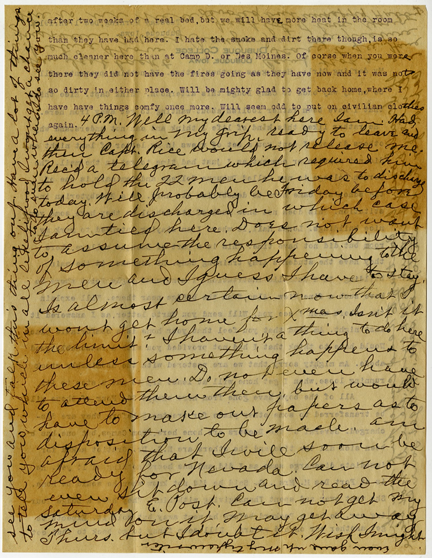 after two weeks of a real bed, but will have more heat in the room than they have here. I hate the smoke and dirt there though, is much cleaner here than at [Camp Dodge] or Des Moines. Of course when you were there they did not have the fires going as they have now and it was not so dirty in either place. Will be mighty glad to get back home, where I have have the things comfy once more. Will seem odd to put on civilian clothes again. 4 P. M. Well my dearest here I am again. Had everything in my grip, ready to leave and then Capt. Rice would not release me. Rec’d a telegram which required him to hold the 22 men he was to discharge today. Will probably be Friday before they are discharged in which case I am tied here. Does not want to assume the responsibility of something happening to the men and I guess I have to stay. Is almost certain now that I wont get home for Xmas. Isn’t it the limit? I haven’t a thing to do here unless something happens to these men. Do not even have to attend [MS illegible: 2 words],but would have to make out papers as to disposition to be made. Am afraid that I will soon be ready for Neveda. Can not even sit down and read the Saturday E. Post. Can not get my mind on it may get away Thurs. but I doubt it. Wish I might [written sideways in the margin] see you and talk this thing out. Have a lot of things to tell you which in all likelihood I won’t get a chance to do even when I do see you.