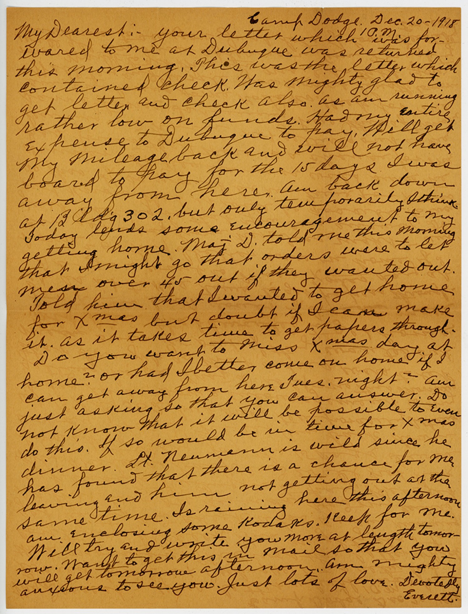Camp Dodge, [December] 20, 1918 1 P. M. My Dearest:- your letter which was forwarded to me at Dubuque was returned this morning. This was the letter which contained check. Was mighty glad to get letter and check also. As am running rather low on funds. Had my entire expense to Dubuque to pay. Will get my mileage back and will not have board to pay for the 15 days. I was away from here. Am back down at Bldg 302, but only temporarily Ithink. Today lends some encouragement to my getting home. Maj. D. told me this morning that I might go that orders were to let men over 45 out if they wanted to get home for Xmas but doubt if Ican make it. As it takes time to get papers through. Do you want to miss Xmas day at home? Or had I better come on home if I can get away from here Tues. night? Am just asking so that you can answer. Do not know that it will be possible to even do this. Lt. Neumann is wild since he has found that there is a chance for me leaving and him not getting out at the same time. Is raining here this afternoon am enclosing some Kodaks. Keep for me. Will try and write you more at length tomorrow. Want to get this in mail so that you will get tomorrow afternoon. Am mighty anxious to see you. Just lots of love. Devotedly Everett.