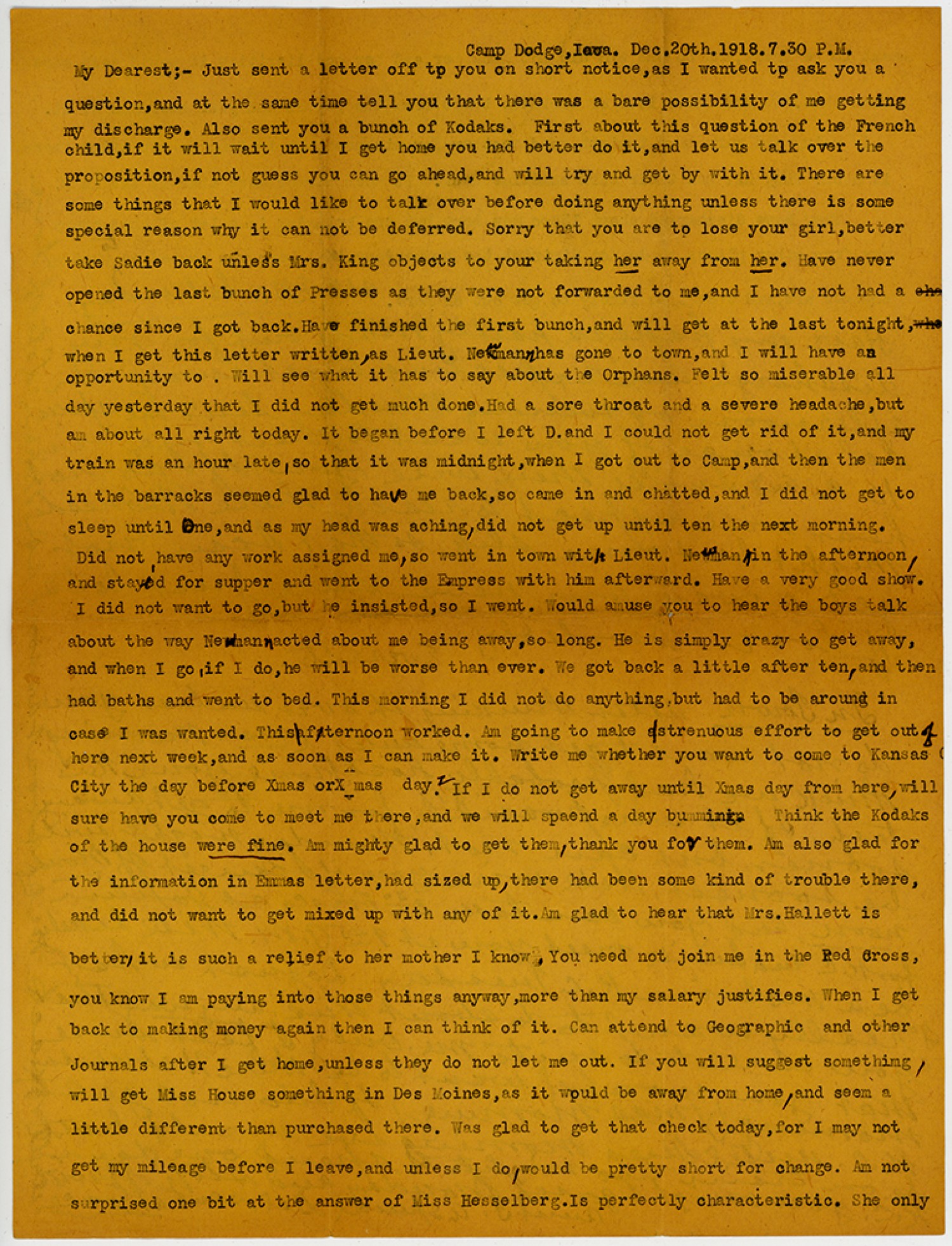 Camp Dodge, Iowa. [December] 20th, 1918 7.30 P.M. My Dearest;- Just sent a letter off tp you on short notices, as I want tp ask you a question,and at the same time tell you that there was a bare possibility of me getting my discharge. Also sent you a bunch of Kodaks. First about this question of the French child, if it will wait until I get home you had better do it,and let us talk over the proposition, if not guess you can go ahead,and will try and get by with it. There are some things that I would like to talk over before doing any thing unless there is some special reason why it can not be deferred. Sorry that you are to lose your girl,better take Sadie back unless Mrs. King objects to your taking her away from her. Have never opened the last bunch of Presses as they were not forwarded to me, and have not had a chance since I got back.Have finished the first bunch, and will get at the last tonight, when I get this letter written, as Lieut. Neumann has gone to town,and I will have an opportunity to . Will see what it has to say about the Orphans. Felt so miserable all day yesterday that I did not get much done.Had a sore throat and a severe headache, but am about all right today. It began before I left [Dubuque] and I could not get rid of it,and my train was an hour late, so that it was midnight, when I got out to [Camp Dodge], and then the men in the barracks seemed glad to have me back, so came in and chatted, and I did not get to sleep until One, and as my head was aching,did not get up unit ten the next morning. Did not have any work assigned me,so went in town with Lieut. Newmann in the afternoon, and stayed for supper and went to the Empress with him afterward. Have a very good show. I did not want to go, but he insisted, so I went. Would amuse you to hear the boys talk about the way Newmann acted about me being away, so long. He is simply crazy to get away, and when I go, if I do, he will be worse than ever. We got back a little after ten, and then had baths and went to bed. This morning I did not do anything, but had to be around in case I was wanted. This afternoon worked. Am going to make a strenuous effort to get out of here next week, and as soon as I can make it. Write me whether you want to come to Kansas City the day befor Xmas or Xmas day? If I do not get away until Xmas Day from here, will sure have you come to meet me there, and we will spend the day bumming. Think the Kodaks of the house were fine. Am mighty glad to get them, thank you for them. Am also glad for the informatjon in Emmas letter, has sized up, there had been some kind of trouble there, and did not want to get mixed up with any of it.Am glad to hear that Mrs. Hallett is better, it is such a relief to her mother I know. You need not join me in the Red Cross, you know I am paying into those things anyway, more than my salary justifies. When I get back to making money again then I can think of it. Can attend to Geographic and other Journals after I get home, unless they do not let me out. If you will suggest something, will get Miss House something in Des Moines, as it would be away from home, and seem a little different than purchased there. Was glad to get that check today, for I amy not get my mileage before I leave, and unless I do,would be pretty short for change. Am not surprised one bit at the answer of Miss Hesselberg. Is perfectly characteristic. She only